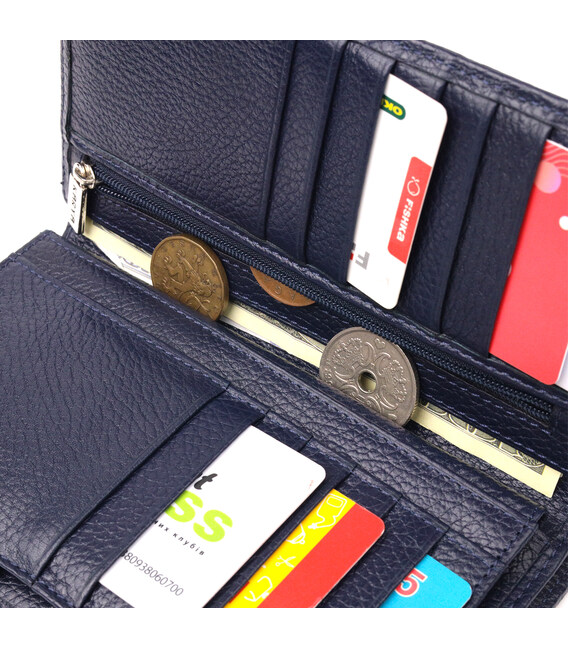 Стильний чоловічий гаманець з натуральної шкіри, в синьому кольорі. Зручне портмоне із натуральної шкіри без застібки. Виріб має дві глибокі кишені для купюр (одна на блискавці). Усередині достатньо осередків для кредиток. Аксесуар упакований у фірмову коробочку. Вироби з натуральної шкіри завжди будуть чудовим подарунком для близької людини.
