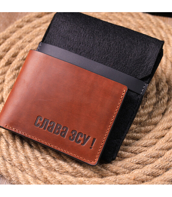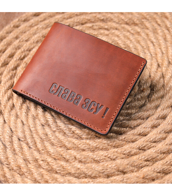 Практичний шкіряний гаманець світло-коричневого кольору, з патріотичним написом "Слава ЗСУ". Виріб пошитий із якісної шкіри, з високими показниками зносостійкості. Портмоне має одне велике відділення для купюр усіх номіналів, а також достатню кількість відділень для карток, без застібки. Шкіряний аксесуар, один з найуніверсальніших подарунків, який довго служитиме і радуватиме власника.