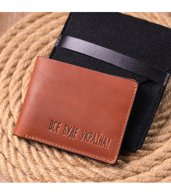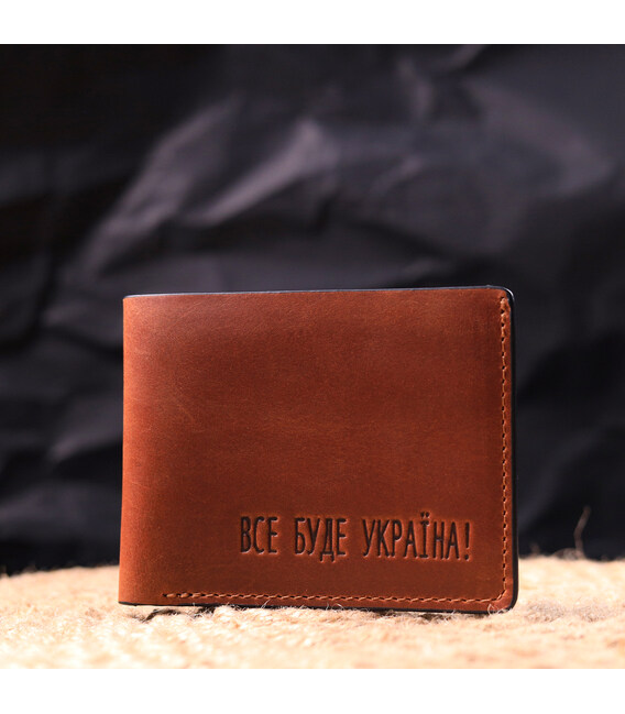 Функціональний шкіряний гаманець світло-коричневого кольору, з патріотичним написом "Все буде Україна". Виріб пошитий із якісної шкіри, з високими показниками зносостійкості. Портмоне має одне велике відділення для купюр усіх номіналів, а також достатню кількість відділень для карток, без застібки. Прекрасний подарунок на всі свята та знаменні дати.