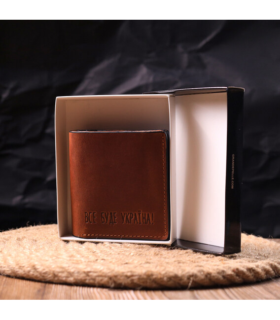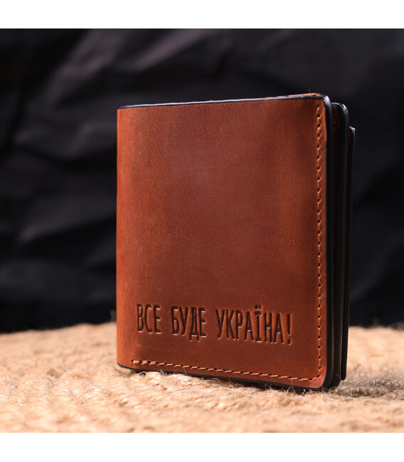Чудовий шкіряний гаманець у світло-коричневому кольорі з патріотичним написом “Все буде Україна”. Виріб пошитий із якісної гладкої шкіри, з високими показниками зносостійкості. Портмоне має два великих відділення для купюр усіх номіналів, а також достатню кількість відділень для карток та монетницю, застібається виріб на надійний магніт. Шкіряний гаманець стане чудовим подарунком на всі випадки життя.