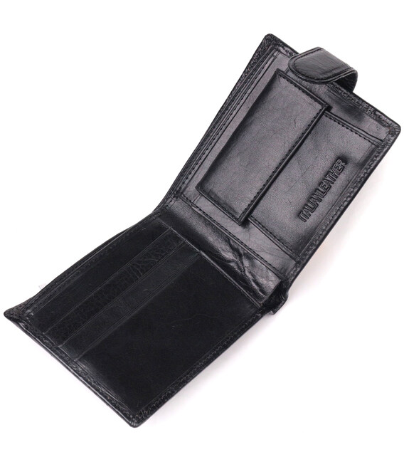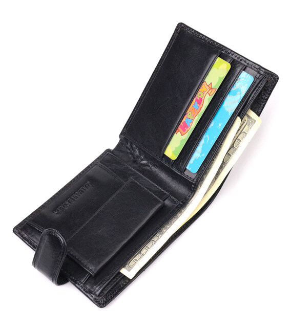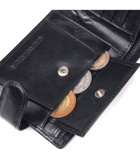 Стандартний чоловічий гаманець у два складання з натуральної гладкої шкіри. Для перегородки між відділеннями використовується натуральна шкіра та міцний текстиль. Виріб складається з трьох великих відділень для купюр, двох прилеглих кишень, трьох осередків для карток та монетниці на кнопці. Продається гаманець у гарній коробці від виробника. Закривається гаманець хлястиком на кнопку.