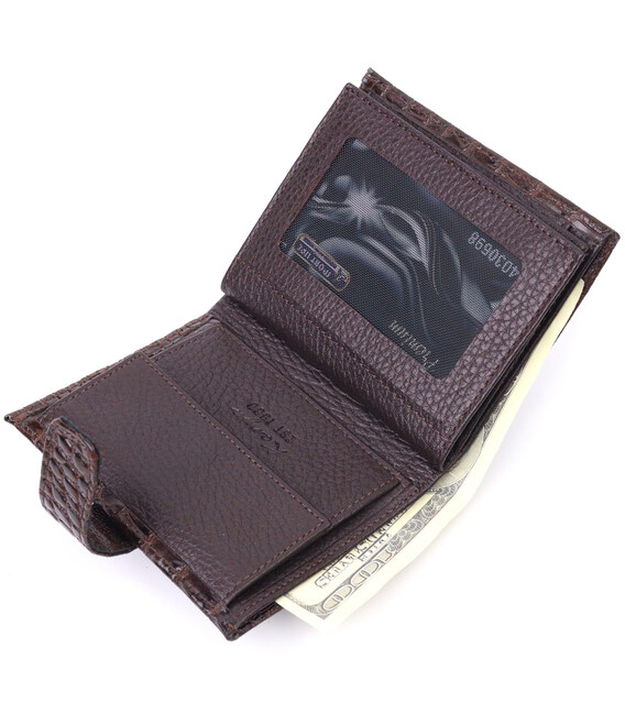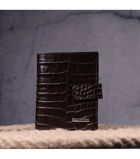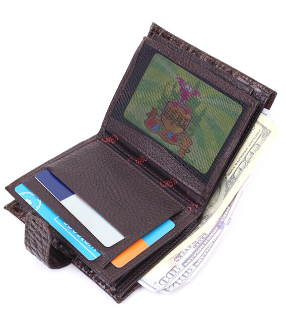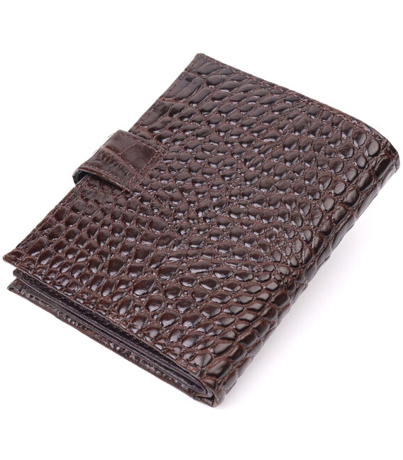 Тонкий компактний портмоне з натуральної шкіри з тисненням під крокодила, що закривається хлястиком на кнопку. Виріб має велику кишеню для купюр. Усередині достатньо осередків для кредиток. Виріб продуманий для сучасної людини. Виріб має насичений коричневий колір. Оригінальний аксесуар вигідно виділить вас із натовпу. Гаманець стане чудовим подарунком для Ваших близьких.