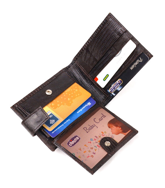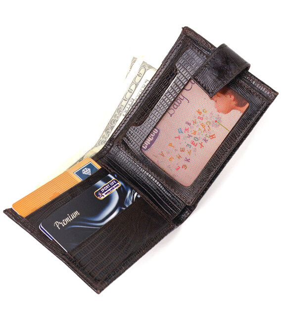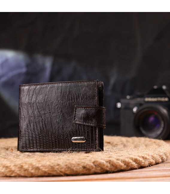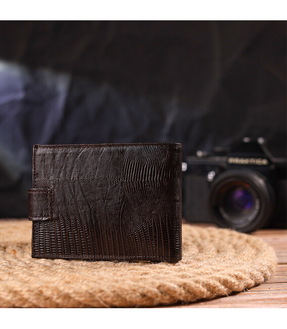 Лакований чоловічий гаманець з натуральної фактурної шкіри з тисненням під рептилію. Аксесуар має одне основне відділення з перегородкою, в яке поміщаються купюри всіх номіналів, дев'ять кишень для карток, дві з яких під сіточкою, монетниця та дві прилеглі кишені. Закривається аксесуар хлястиком на кнопку. Колір фурнітури – срібло. Ви легко зможете помістити його в кишеню штанів чи маленьку сумку. Запакований гаманець картонну коробку. Шкіряний гаманець є чудовим подарунком для рідних та близьких людей.