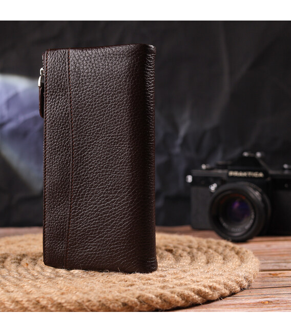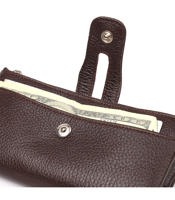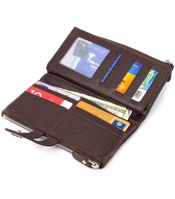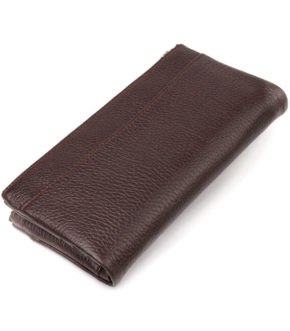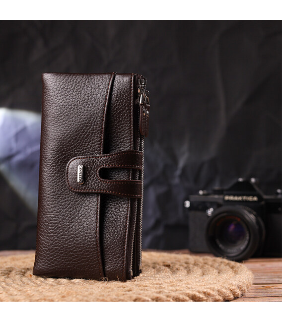 Місткий жіночий гаманець із натуральної зернистої шкіри. Аксесуар має два широкі основні відділення, в які поміщаються купюри всіх номіналів, дві монетниці, двадцять чотири кишені для карток, дві відкриті кишені зовні та одне прозоре віконце для документів. Закривається аксесуар хлястиком на кнопку. Якщо Ви хочете порадувати себе та здивувати близьких, то неодмінно купуйте шкіряні аксесуари в нашому магазині, якість і ціна Вас однозначно порадує.
