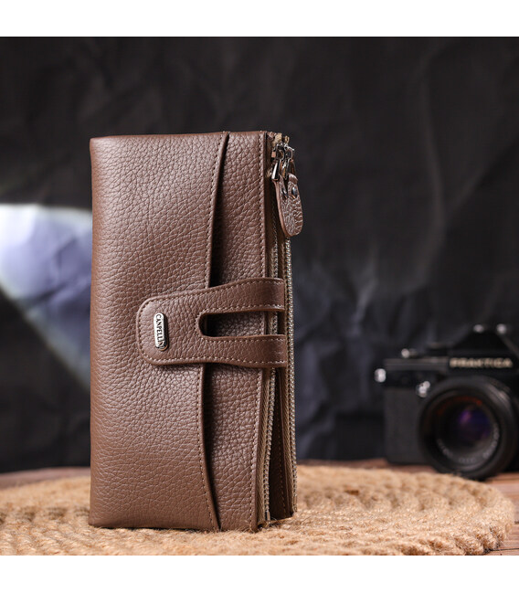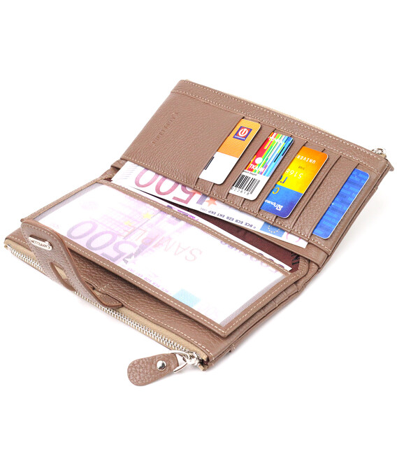 Ніжний жіночий гаманець із натуральної зернистої шкіри. Аксесуар має два широкі основні відділення, в які поміщаються купюри всіх номіналів, дві монетниці, двадцять чотири кишені для карток, дві відкриті кишені зовні та одне прозоре віконце для документів. Закривається аксесуар хлястиком на кнопку. Якщо Ви хочете порадувати себе та здивувати близьких, то неодмінно купуйте шкіряні аксесуари в нашому магазині, якість і ціна Вас однозначно порадує.