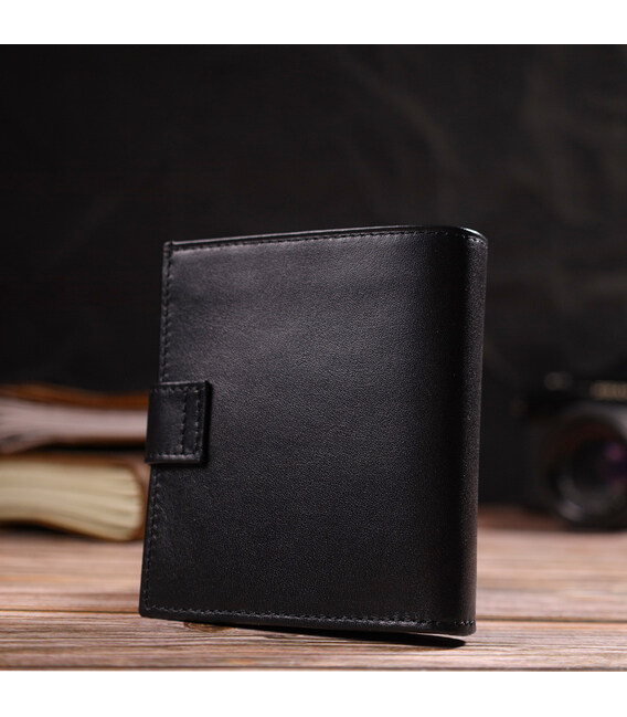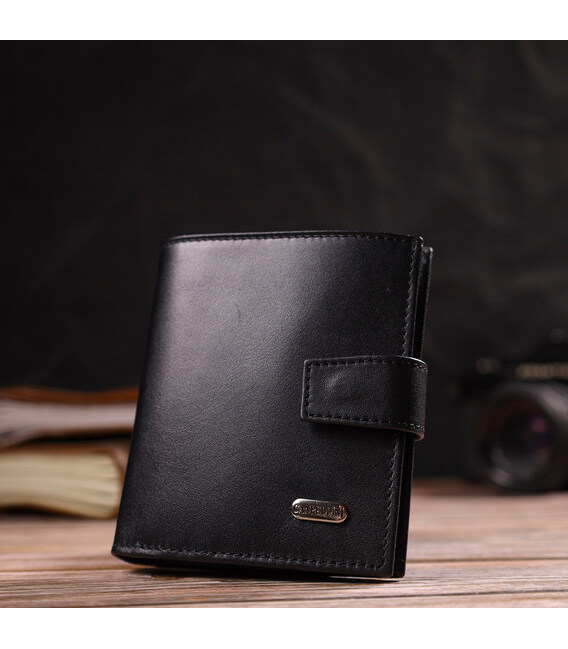 Невеликий чоловічий гаманець із натуральної гладкої шкіри вертикального формату. Аксесуар має основне відділення з перегородкою, п'ять відсіків для карток, дві прилеглі кишені, прозору кишеню для документів та монетницю. Закривається аксесуар хлястиком на кнопку. Відмінний аксесуар від надійного виробника, що прослужить дуже довго.