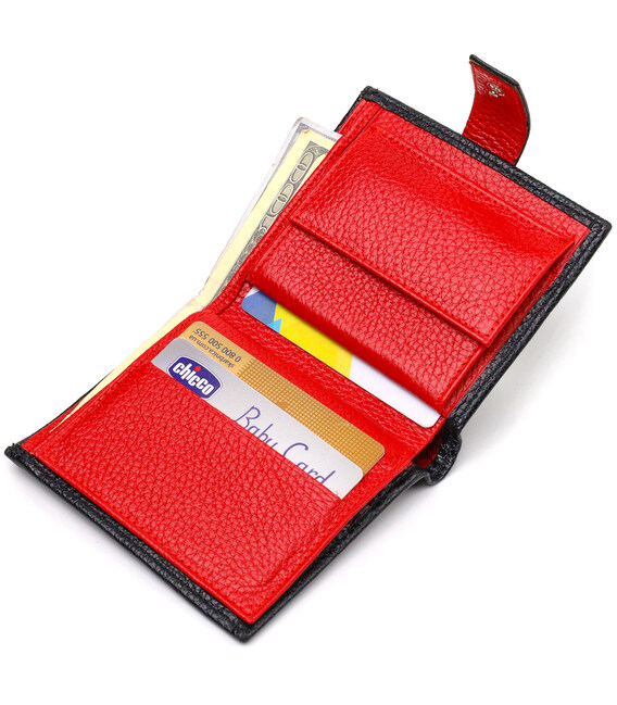 Компактний чоловічий гаманець із натуральної зернистої шкіри вертикального формату, чорного кольору зовні та червоного всередині. Аксесуар має основне відділення з перегородкою, п'ять відсіків для карток, дві прилеглі кишені, прозору кишеню для документів та монетницю. Закривається аксесуар хлястиком на кнопку. Відмінний аксесуар від надійного виробника, що прослужить дуже довго.