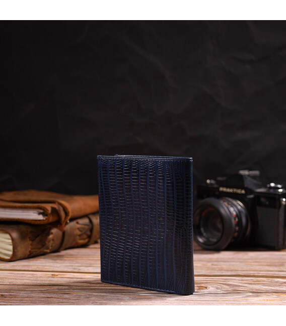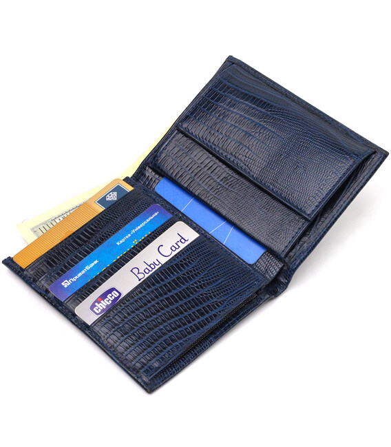 Лакований чоловічий гаманець у красивому синьому кольорі з натуральної фактурної шкіри. Аксесуар має одне основне відділення з перегородкою, в яке поміщаються купюри всіх номіналів, шість кишень для карток, дві кишені під сіточкою для документів, монетницю та одну прилеглу кишеню. Закривається аксесуар навпіл без застібки. Запакований гаманець картонну коробку. Шкіряний гаманець є чудовим подарунком для рідних та близьких людей.