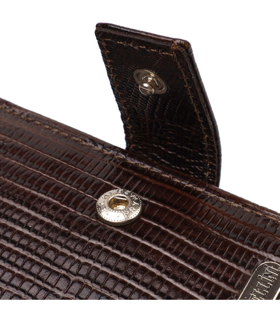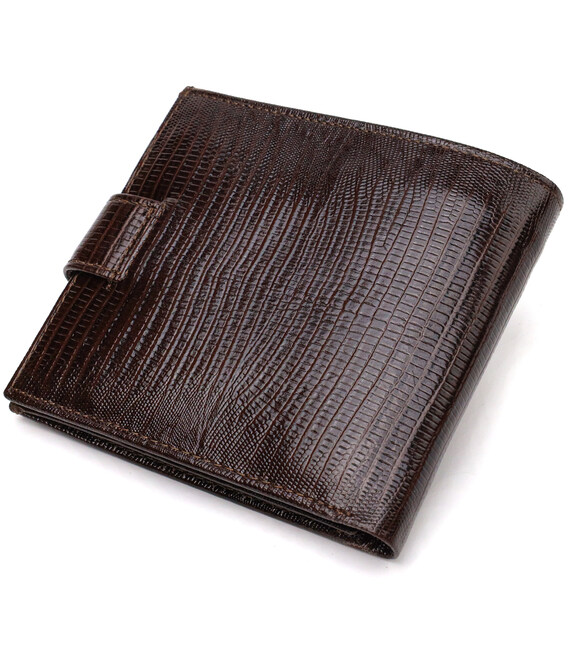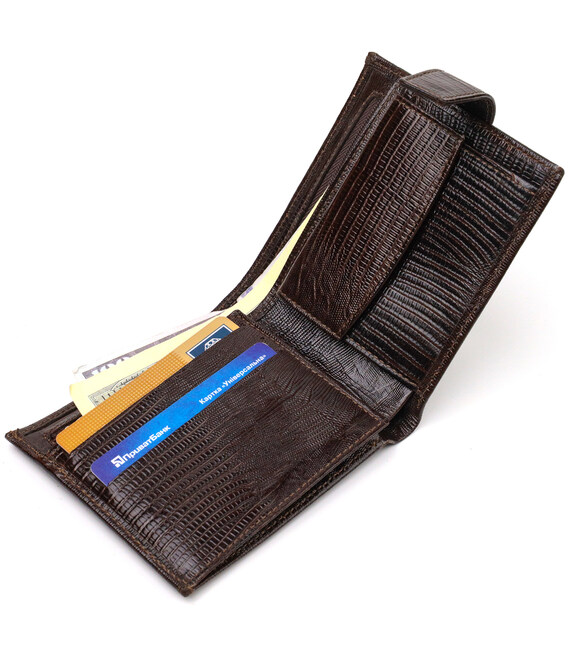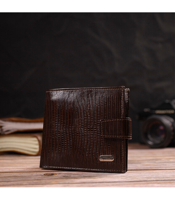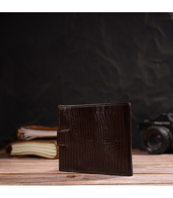 Місткий чоловічий гаманець із натуральної фактурної шкіри. Аксесуар має основне відділення для купюр, три осередки для карток, дві кишені під сіточкою, кишеню на блискавці через усю довжину та монетницю, що закривається клапаном на кнопку. Гаманець складається навпіл і закривається хлястиком на кнопку. На лицьовій стороні в правому нижньому кутку розташований металевий логотип компанії виробника. Багатофункціональний чоловічий гаманець з дуже міцної шкіри чудовий вибір подарунка для солідного чоловіка.