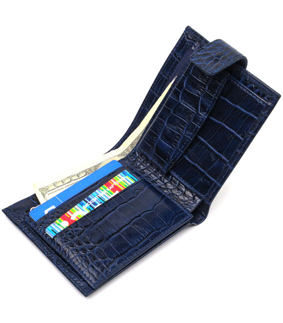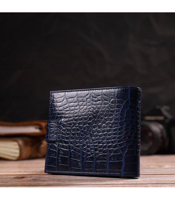 Стильне чоловіче портмоне із натуральної фактурної шкіри з тисненням під крокодила. Аксесуар має одне основне відділення з кишенею-перегородкою, в яке розміщуються купюри всіх номіналів, шість кишень для карток, кишеня під сіточкою для документів та монетницю. Закривається аксесуар навпіл шкіряним хлястиком на кнопку. Запакований гаманець картонну коробку.
