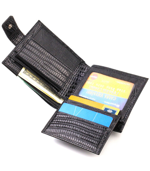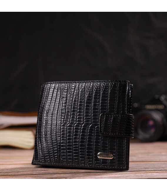Практичне чоловіче портмоне із натуральної фактурної шкіри з тисненням. Аксесуар має одне основне відділення з кишенею-перегородкою, в яке розміщуються купюри всіх номіналів, шість кишень для карток, кишеня під сіточкою для документів та монетницю. Закривається аксесуар навпіл шкіряним хлястиком на кнопку. Запакований гаманець картонну коробку.