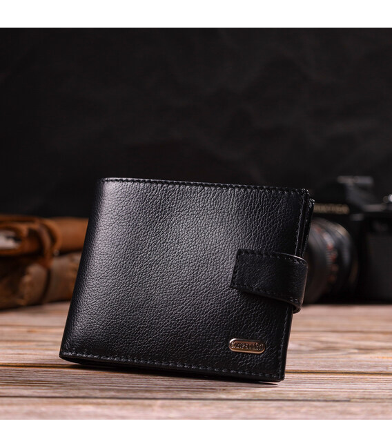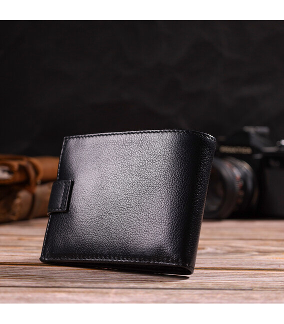 Зручний чоловічий гаманець середнього розміру із натуральної шкіри флотар. Аксесуар має основне відділення для купюр з перегородкою, чотири осередки для карток, дві кишені під сіточкою, три прилеглі кишені та монетницю. Гаманець складається навпіл, закривається хлястиком на кнопку. На лицьовій стороні в правому нижньому кутку розташований металевий логотип компанії виробника. Купуючи шкіряний гаманець у нашому магазині, Ви отримуєте модний, стильний аксесуар, який прослужить не один рік.