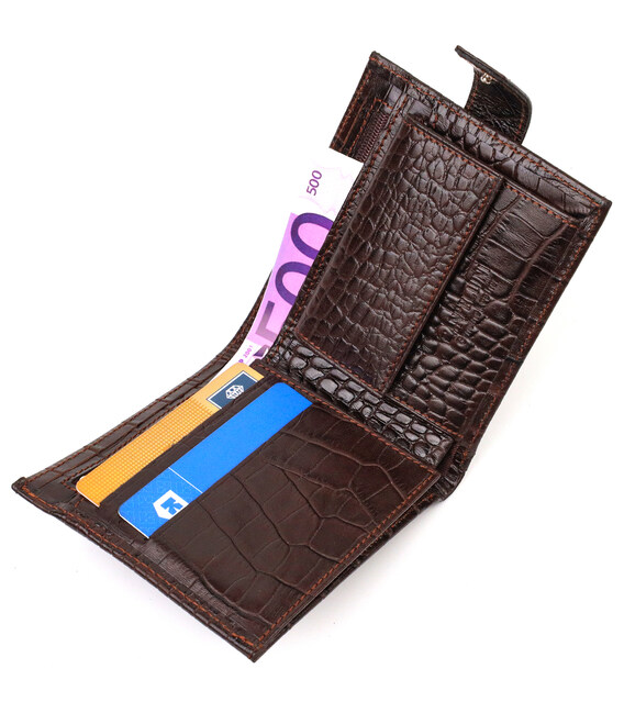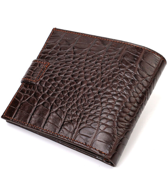 Модний чоловічий гаманець із натуральної шкіри з тисненням під крокодила. Аксесуар має основне відділення для купюр, три осередки для карток, дві кишені під сіточкою, кишеню на блискавці через усю довжину та монетницю, що закривається клапаном на кнопку. Гаманець складається навпіл і закривається хлястиком на кнопку. На лицьовій стороні в правому нижньому кутку розташований металевий логотип компанії виробника. Багатофункціональний чоловічий гаманець з дуже міцної шкіри чудовий вибір подарунка для солідного чоловіка.