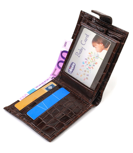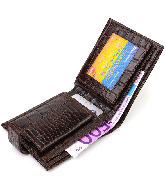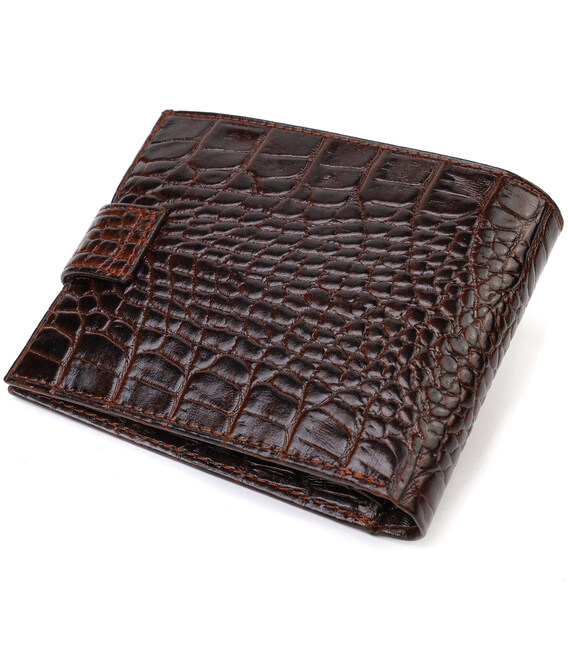 Надійне чоловіче портмоне середнього розміру з натуральної шкіри з тисненням під крокодила. Аксесуар має основне відділення для купюр з кишенею-перегородкою на блискавці, три осередки для карток, дві кишені під сіточкою, дві прилеглі кишені та монетницю. Гаманець складається навпіл, закривається хлястиком на кнопку. На лицьовій стороні в правому нижньому кутку розташований металевий логотип компанії виробника. Багатофункціональний чоловічий гаманець з дуже міцної шкіри чудовий вибір подарунка для солідного чоловіка.