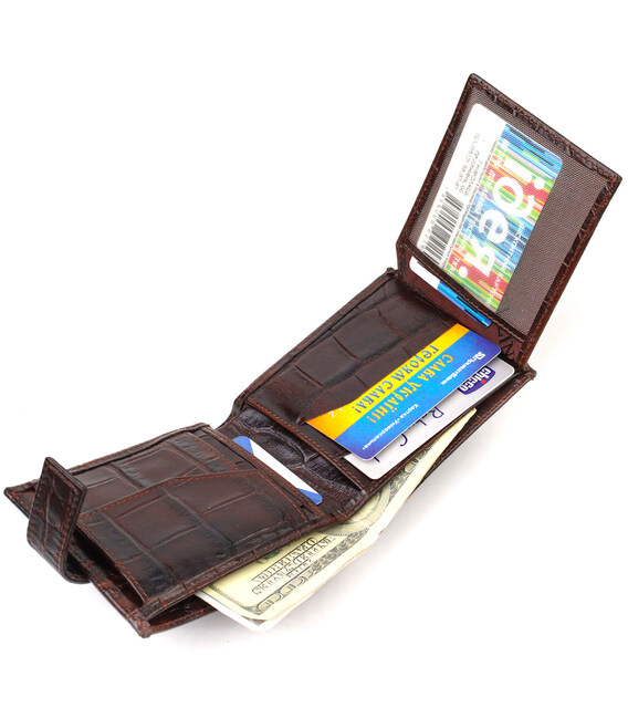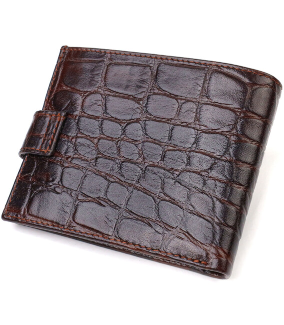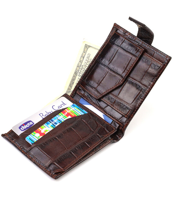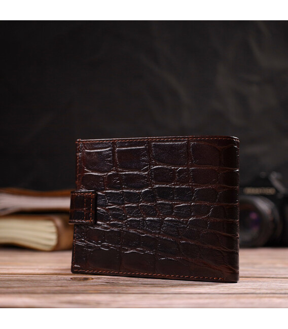 Зручний чоловічий гаманець компактного розміру із натуральної фактурної шкіри із тисненням під крокодила. Аксесуар має основне відділення для купюр з перегородкою, шість осередків для карток, одна кишеня під сіточкою, дві прилеглі кишені та монетницю. Гаманець складається навпіл, закривається хлястиком на кнопку. На лицьовій стороні в правому нижньому кутку розташований металевий логотип компанії виробника. Купуючи шкіряний гаманець у нашому магазині, Ви отримуєте модний, стильний аксесуар, який прослужить не один рік.