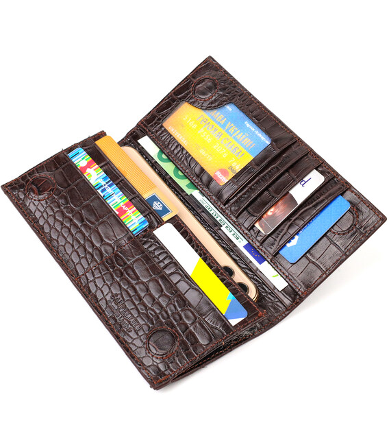 Вертикальний вузький чоловічий гаманець із натуральної шкіри із тисненням під крокодила. Аксесуар має одне основне відділення в яке поміщаються купюри всіх номіналів, одинадцять кишень для карток (одна під сіточкою), дві приховані кишені та кишеня на блискавці всередині. Закривається аксесуар навпіл на магніти. Купуючи шкіряний аксесуар цієї фірми, собі або на подарунок, будьте певні, що він прослужить Вам не один рік.