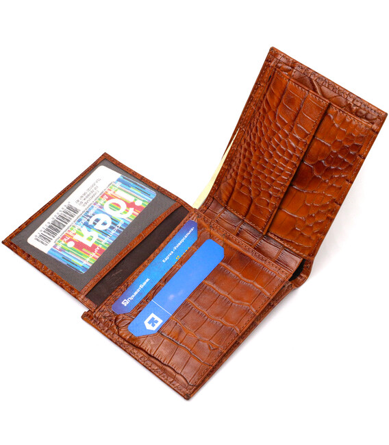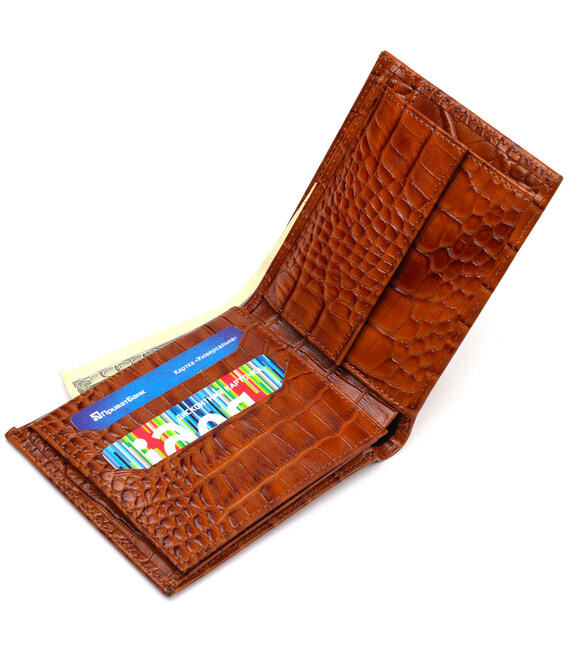 Ультрамодний чоловічий гаманець із натуральної шкіри з тисненням під крокодила. Аксесуар має одне відділення для купюр усіх номіналів, шість осередків для карток, три кишені під сіточкою для документів та монетницю. Закривається аксесуар навпіл без застібки. На лицьовій стороні, у правому нижньому куті металевий логотип компанії виробника. Купуючи шкіряний аксесуар цієї фірми, собі або на подарунок, будьте певні, що він прослужить Вам не один рік.
