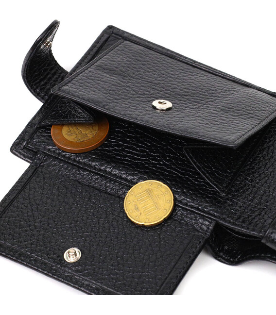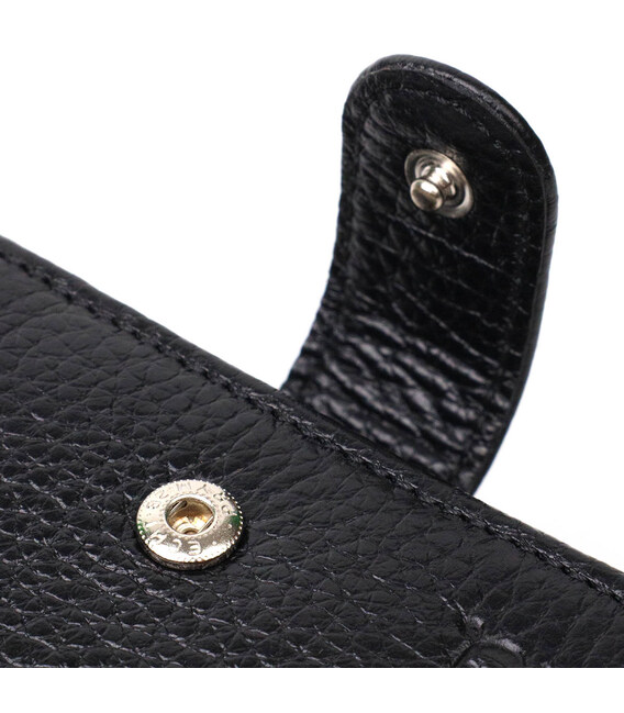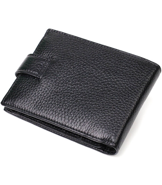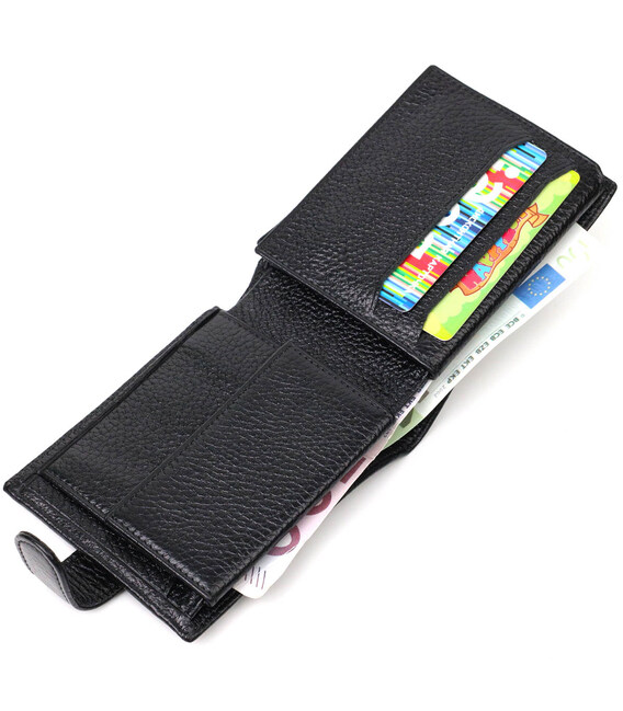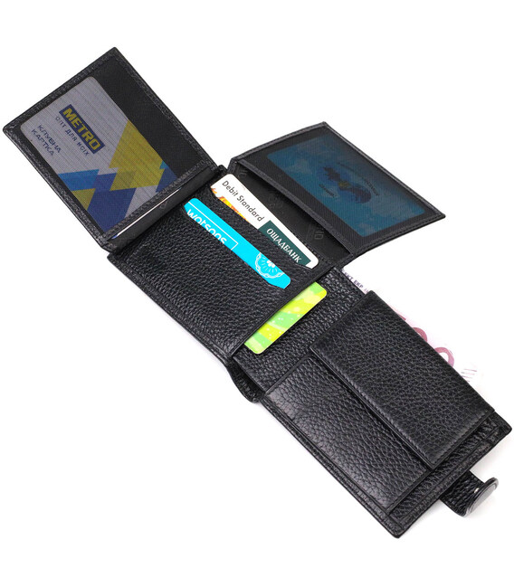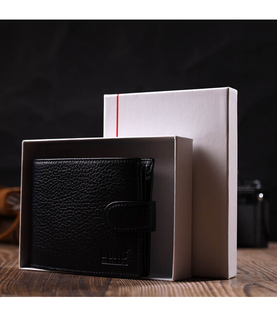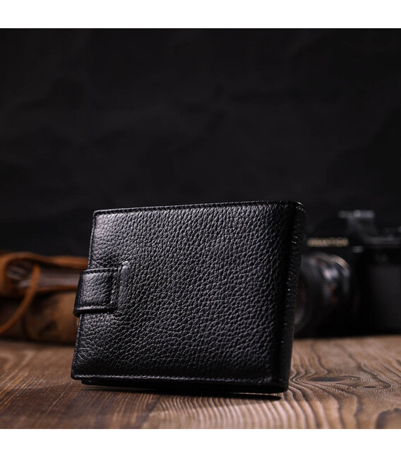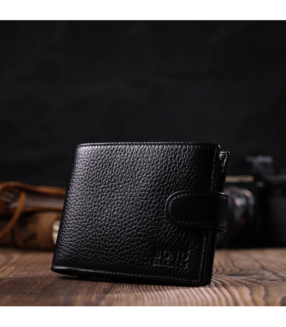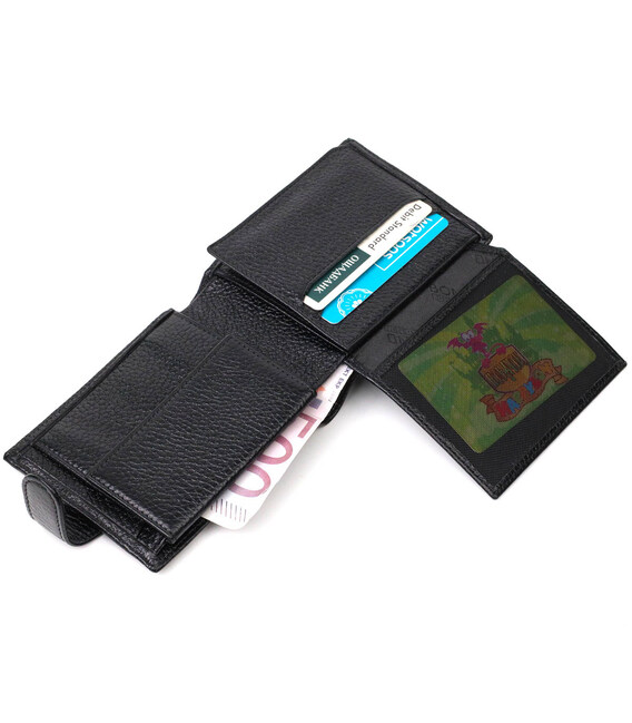 Функціональний гаманець для купюр виконаний із добротної натуральної шкіри чорного кольору. У цей аксесуар чудово поміщаються купюри всіх номіналів. Виріб складається з двох відділень для купюр, дев'яти осередків для кредиток, однієї прихованої кишені, монетниці та двох відділень під сіткою під документи. Закривається гаманець шкіряним хлястиком на кнопку. Вироби з натуральної шкіри завжди будуть чудовим подарунком для близької людини.