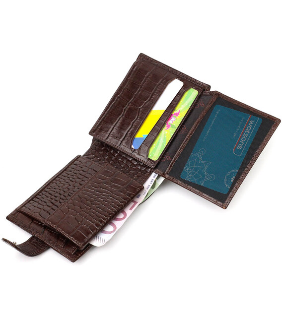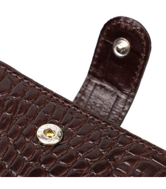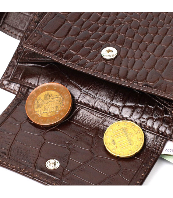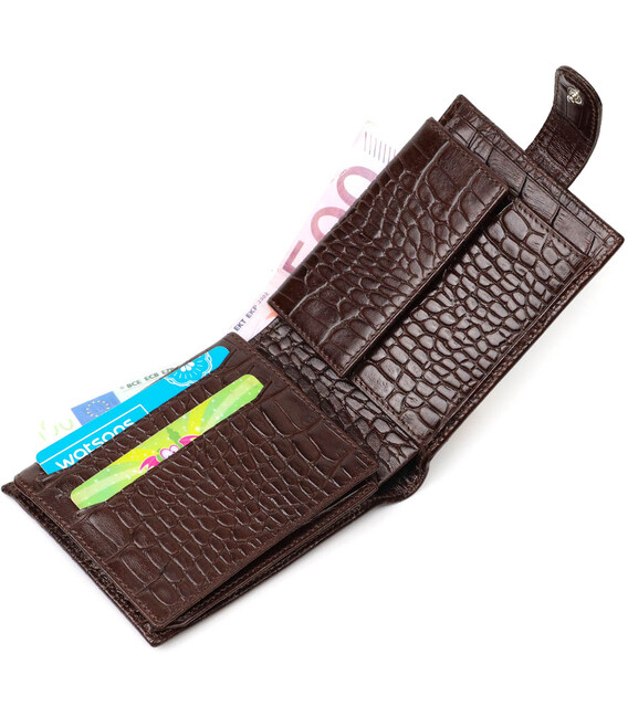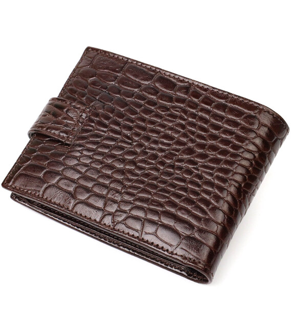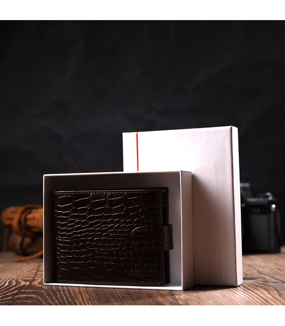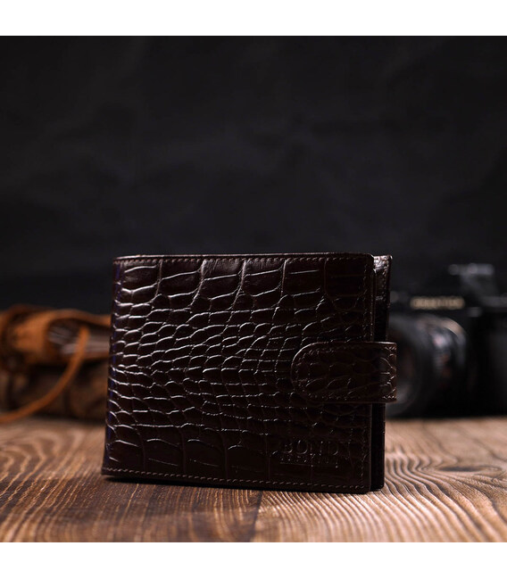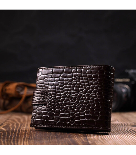 Універсальний гаманець для купюр виконаний з добротної натуральної шкіри коричневого кольору з тисненням під крокодила. У цей аксесуар чудово поміщаються купюри всіх номіналів. Виріб складається з двох відділень для купюр, дев'яти осередків для кредиток, однієї прихованої кишені, монетниці та двох відділень під сіткою під документи. Закривається гаманець шкіряним хлястиком на кнопку. Вироби з натуральної шкіри завжди будуть чудовим подарунком для близької людини.