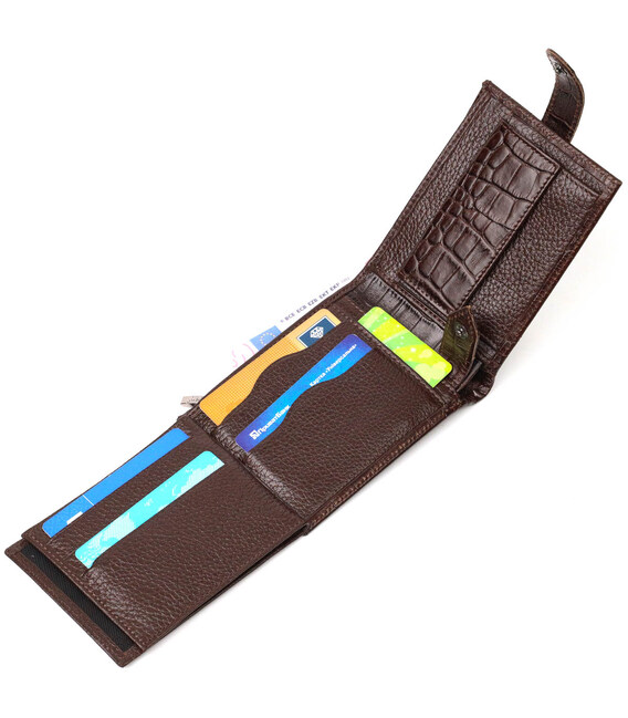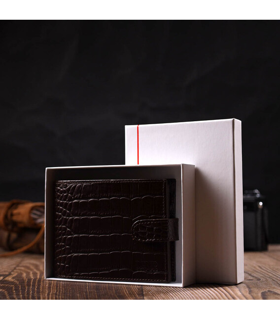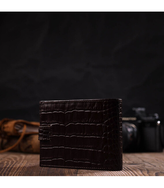 Цікавий гаманець середнього розміру, горизонтального типу, виготовлений з добротної натуральної шкіри, з тисненням під крокодила. У цей аксесуар чудово поміщаються купюри всіх номіналів. Виріб складається з трьох відділень для купюр, шести осередків для кредиток, чотирьох прихованих кишень, монетниці та трьох відділень під сіткою під документи. Закривається гаманець навпіл шкіряним хлястиком на кнопку. Вироби з натуральної шкіри завжди будуть чудовим подарунком для близької людини.
