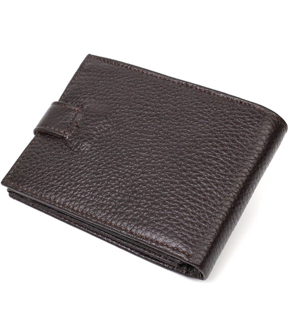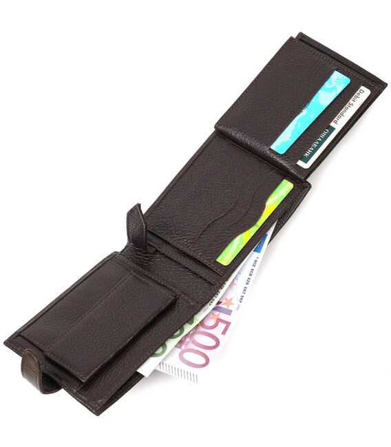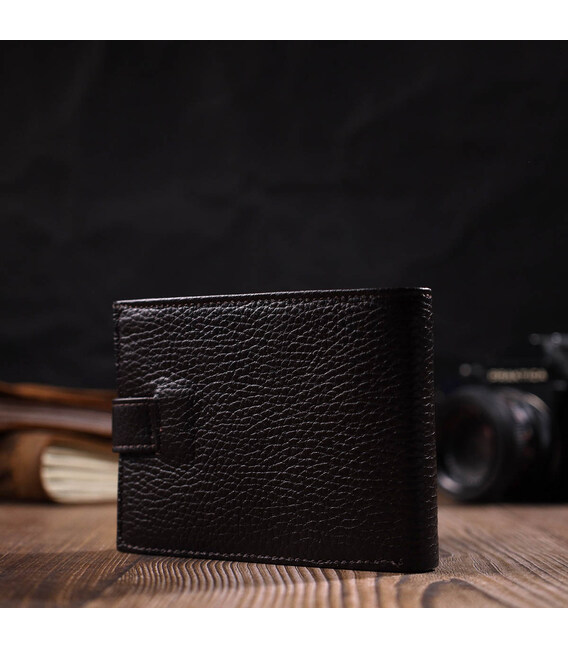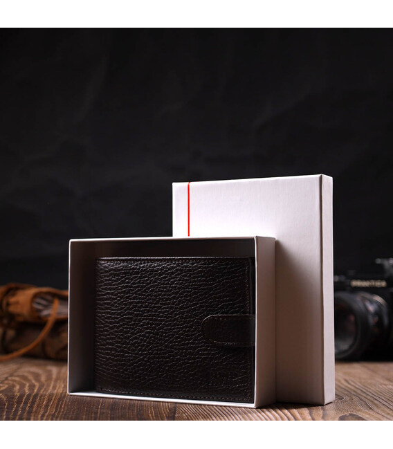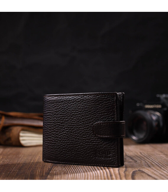 Незамінний для чоловіків аксесуар - гаманець середнього розміру, горизонтального типу, виготовлений з добротної натуральної шкіри. У цей аксесуар чудово поміщаються купюри всіх номіналів. Виріб складається з трьох відділень для купюр, шести осередків для кредиток, чотирьох прихованих кишень, монетниці та трьох відділень під сіткою під документи. Закривається гаманець навпіл шкіряним хлястиком на кнопку. Вироби з натуральної шкіри завжди будуть чудовим подарунком для близької людини.