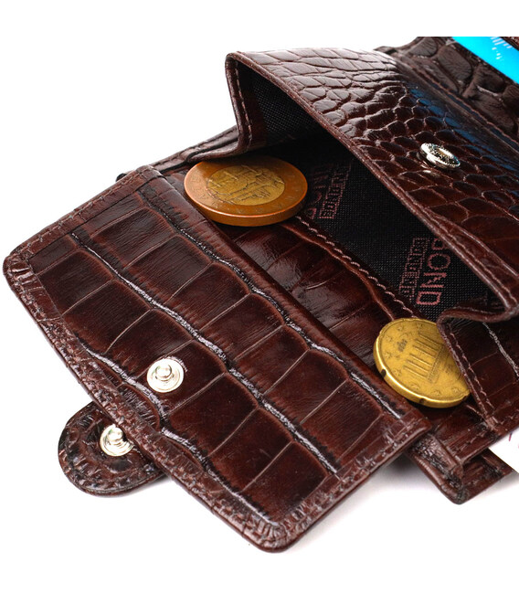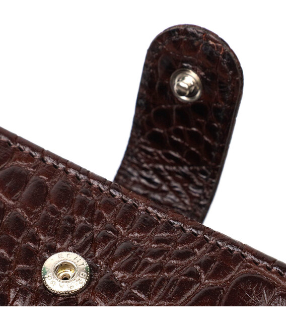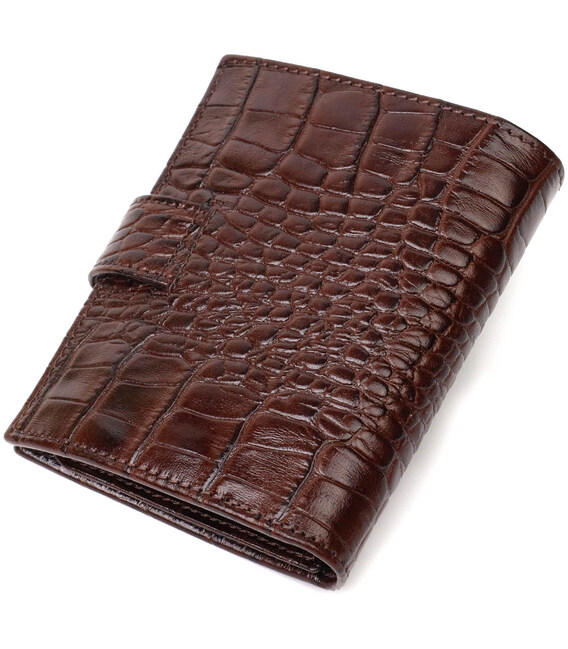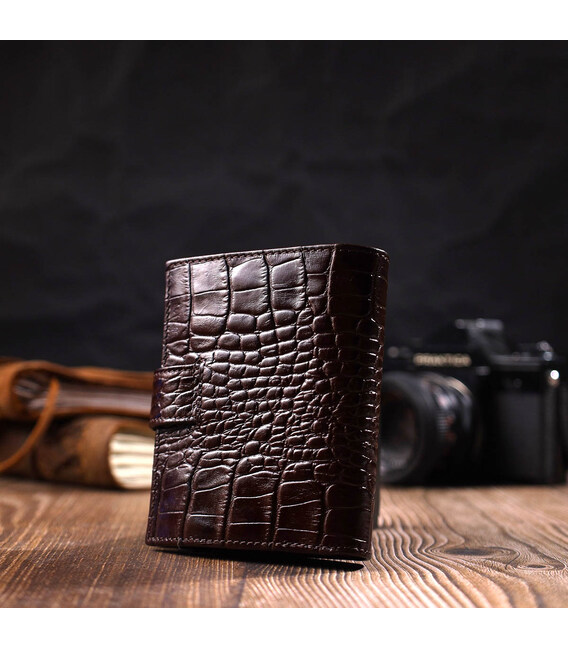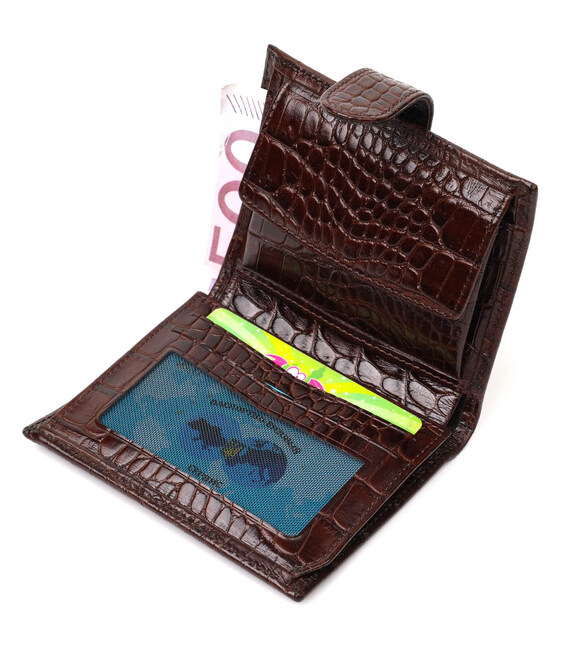 Модне портмоне з натуральної шкіри з тисненням під крокодила, м'яке та приємне на дотик. Аксесуар складається з двох відділень для купюр, шести осередків для пластикових карток, двох прилеглих кишень та монетниці. У виробі використано якісну фурнітуру. Закривається гаманець хлястиком на кнопку. Якісний і надійний гаманець - саме такий аксесуар повинен бути у кожної людини, що поважає себе.