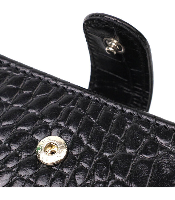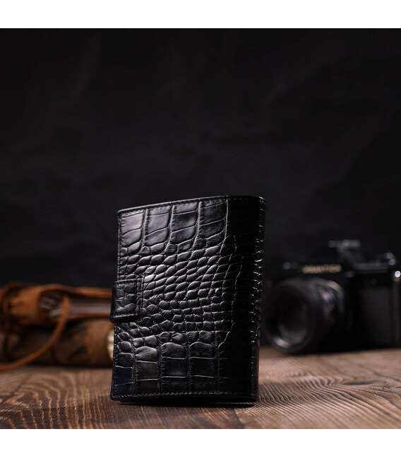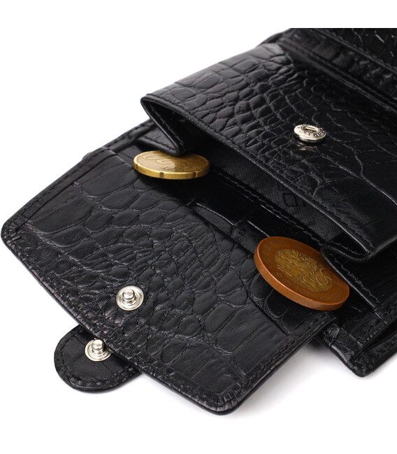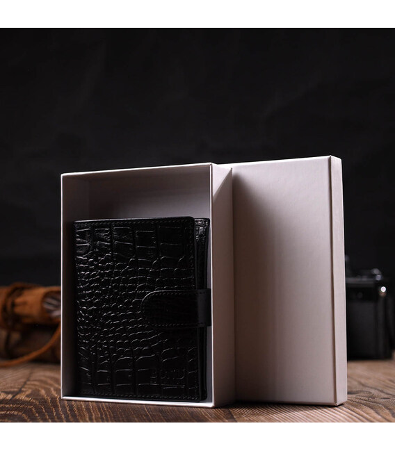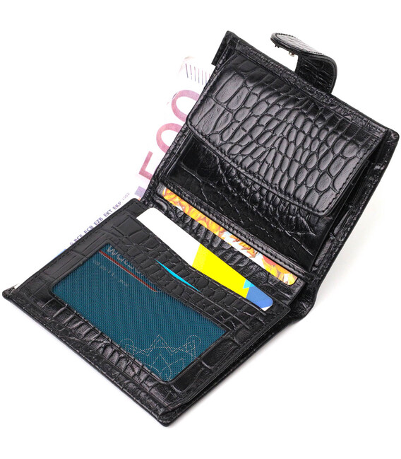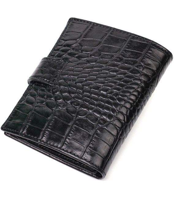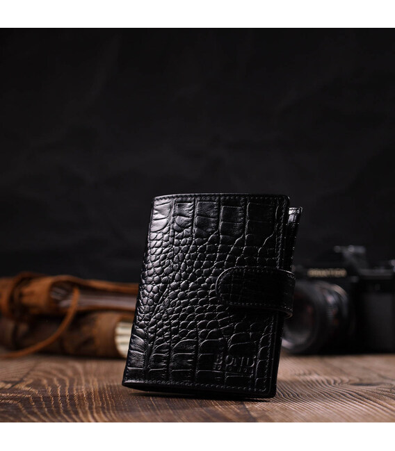 Стильне портмоне з натуральної шкіри з тисненням під крокодила, м'яке та приємне на дотик. Аксесуар складається з двох відділень для купюр, шести осередків для пластикових карток, двох прилеглих кишень та монетниці. У виробі використано якісну фурнітуру. Закривається гаманець хлястиком на кнопку. Якісний і надійний гаманець - саме такий аксесуар повинен бути у кожної людини, що поважає себе.
