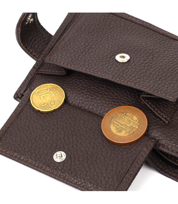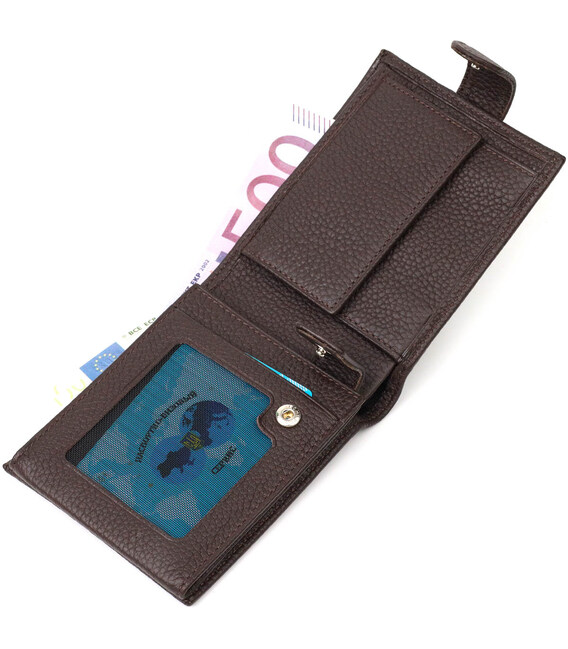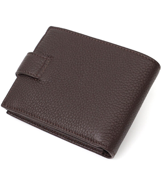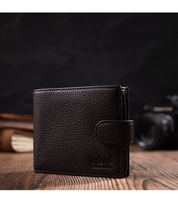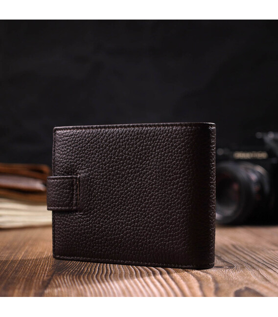 Стильне чоловіче портмоне з натуральної м'якої шкіри. У цей аксесуар чудово поміщаються купюри всіх номіналів. Виріб складається з двох відділень для купюр, шести осередків для кредиток, однієї прихованої кишені, монетниці та трьох відділень під сіткою під документи. Закривається гаманець навпіл шкіряним хлястиком на кнопку. Вироби з натуральної шкіри завжди будуть чудовим подарунком для близької людини.