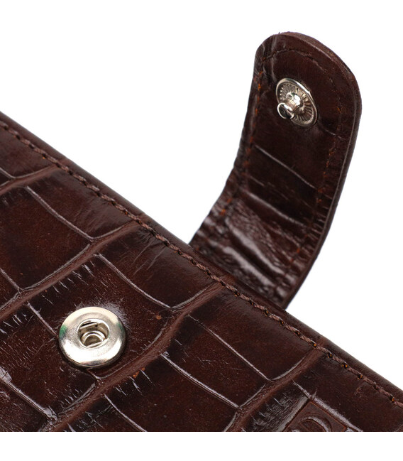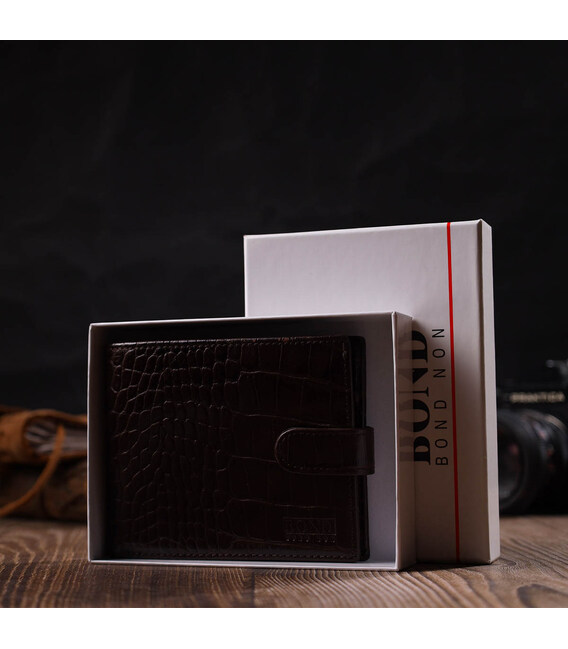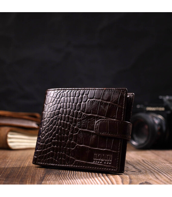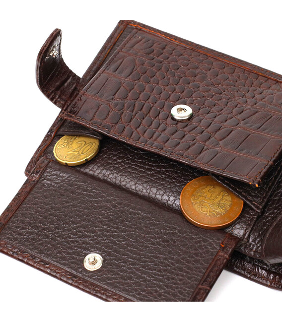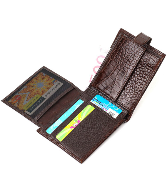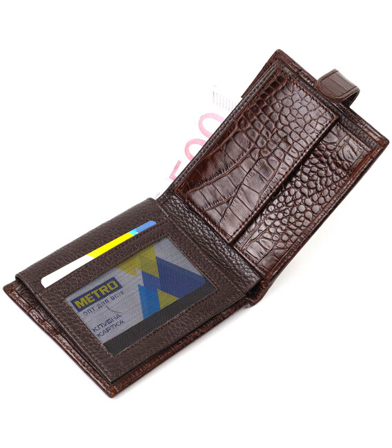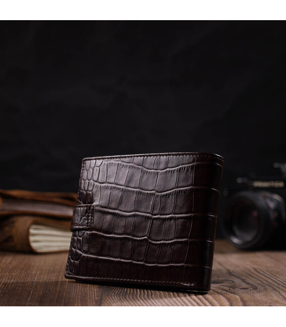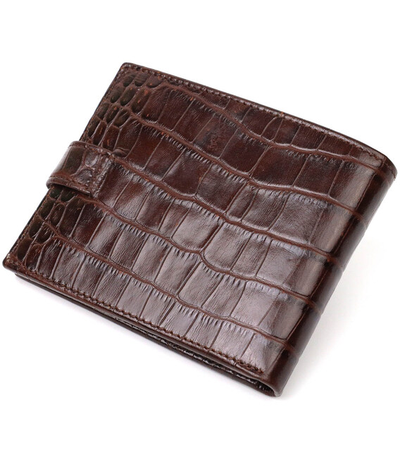 Стильне чоловіче портмоне з натуральної шкіри горизонтального типу з тисненням під крокодила. У цей аксесуар чудово поміщаються купюри всіх номіналів. Виріб складається з трьох відділень для купюр, трьох осередків для кредиток, трьох прихованих кишень, двох відділень під сіткою та монетниці. Закривається гаманець навпіл шкіряним хлястиком на кнопку. Вироби з натуральної шкіри завжди будуть чудовим подарунком для близької людини.