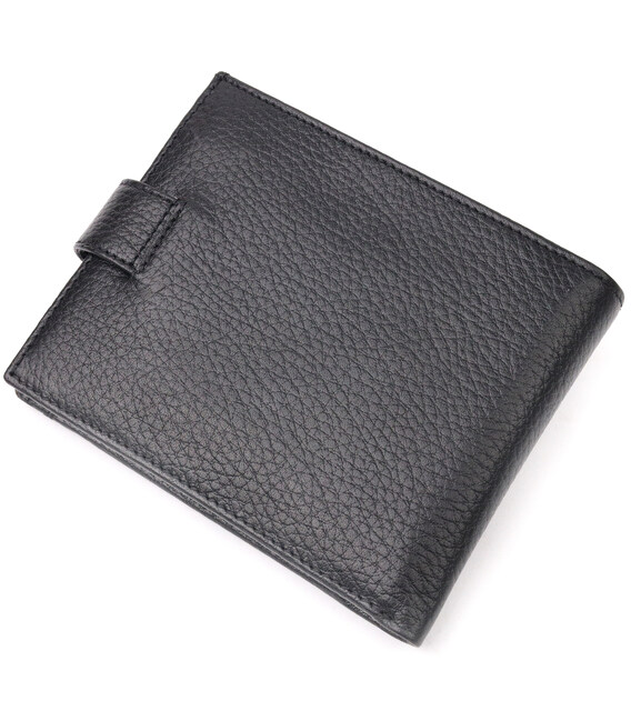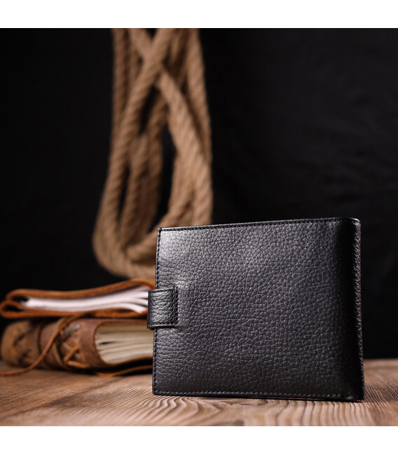 Відмінний чоловічий гаманець із натуральної шкіри, в класичному чорному кольорі. Із зовнішнього боку знаходиться кишеня з блоком під картки та документи. Закривається гаманець хлястиком із кнопкою. Має стандартний горизонтальний формат, поміщається в кишеню. Вироби з натуральної шкіри завжди будуть чудовим подарунком для близької людини.