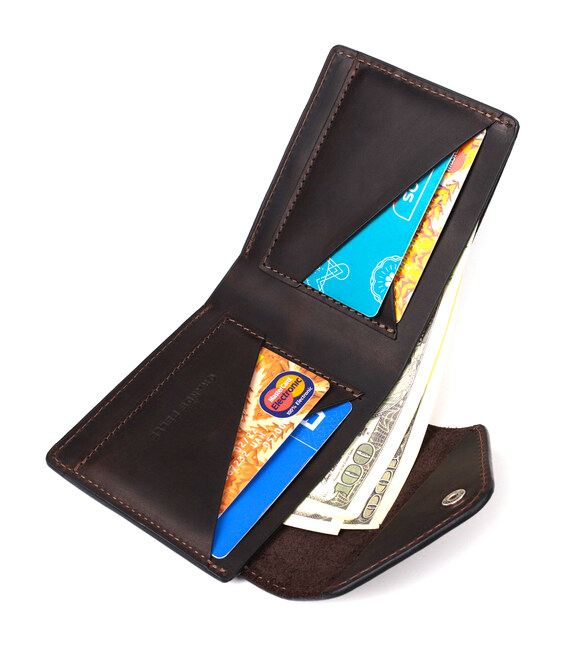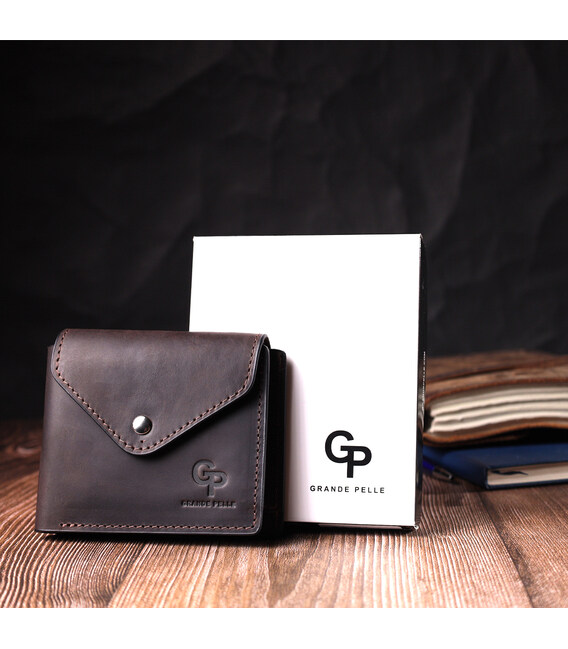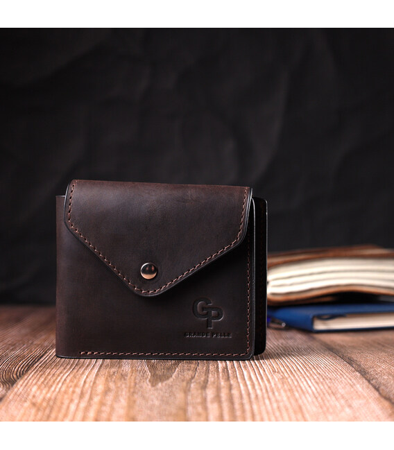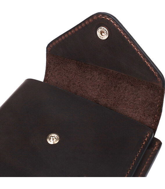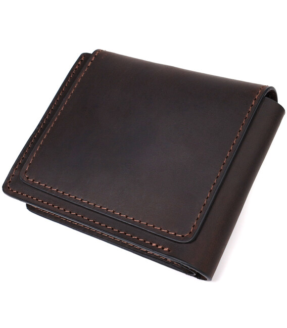Стильне горизонтальне портмоне, виготовлене тільки з натуральної шкіри найвищої якості, без тканинної підкладки. Виріб виконаний у вінтажній шкірі, яка має підвищену міцність завдяки оригінальній фінішній обробці "крейзі хорс". Фішкою цього гаманця є трикутний клапан зверху, на який закривається аксесуар. Дане портмоне ідеальний варіант для сучасної людини, яка вважає за краще носити мінімум готівки і вибирає картки. Портмоне упаковане у фірмову коробку. Дане портмоне стане найкращим подарунком для ваших близьких.