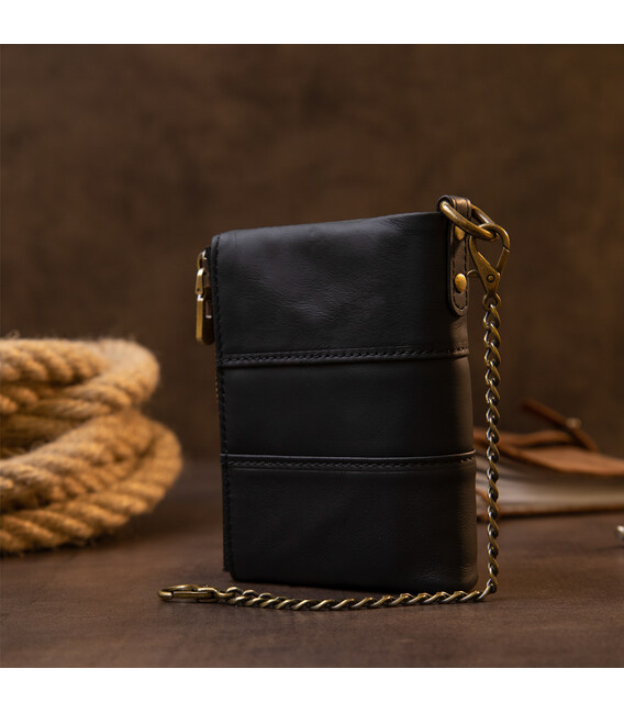 Компактний і дуже функціональний гаманець з натуральної шкіри в чорному кольорі. Унікальною особливістю такого гаманця є те, що ви самі можете регулювати обсяг наповненості гаманця. У аксесуара 2 кнопочки. Величезний функціонал вразить будь-якого клієнта. Гаманець зовсім не примхливий у використанні. І відмінно носиться роками. З таким функціональним гаманцем ви точно нічого не забудете. Ви також можете носити гаманець на ланцюжку. Може бути прекрасним подарунком для близької людини.