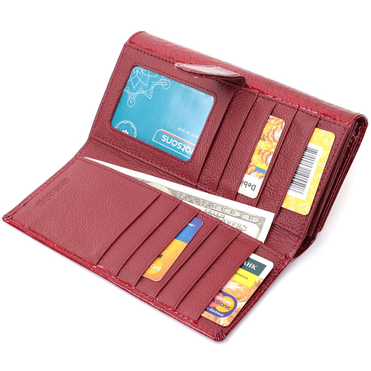 Місткий жіночий гаманець із високоякісної лакованої шкіри з тисненням під рептилію. Має все необхідне, щоб стати Вам незамінним аксесуаром у повсякденному рутинному житті. Ви легко помістите в нього паперові купюри, монети, документи. Фішкою цього гаманця є блок для карт, особливістю якого є наявність двох кнопок, що дозволяє регулювати заповнення блоку. На лицьовій стороні, у правому нижньому кутку розташований металевий логотип виробника, що є запорукою якості виробу. Запакований аксесуар у білу щільну картонну коробку з фірмовим логотипом. Якщо Ви вирішите такий аксесуар подарувати близькій людині, то Вам гарантовано будуть дуже вдячні.
