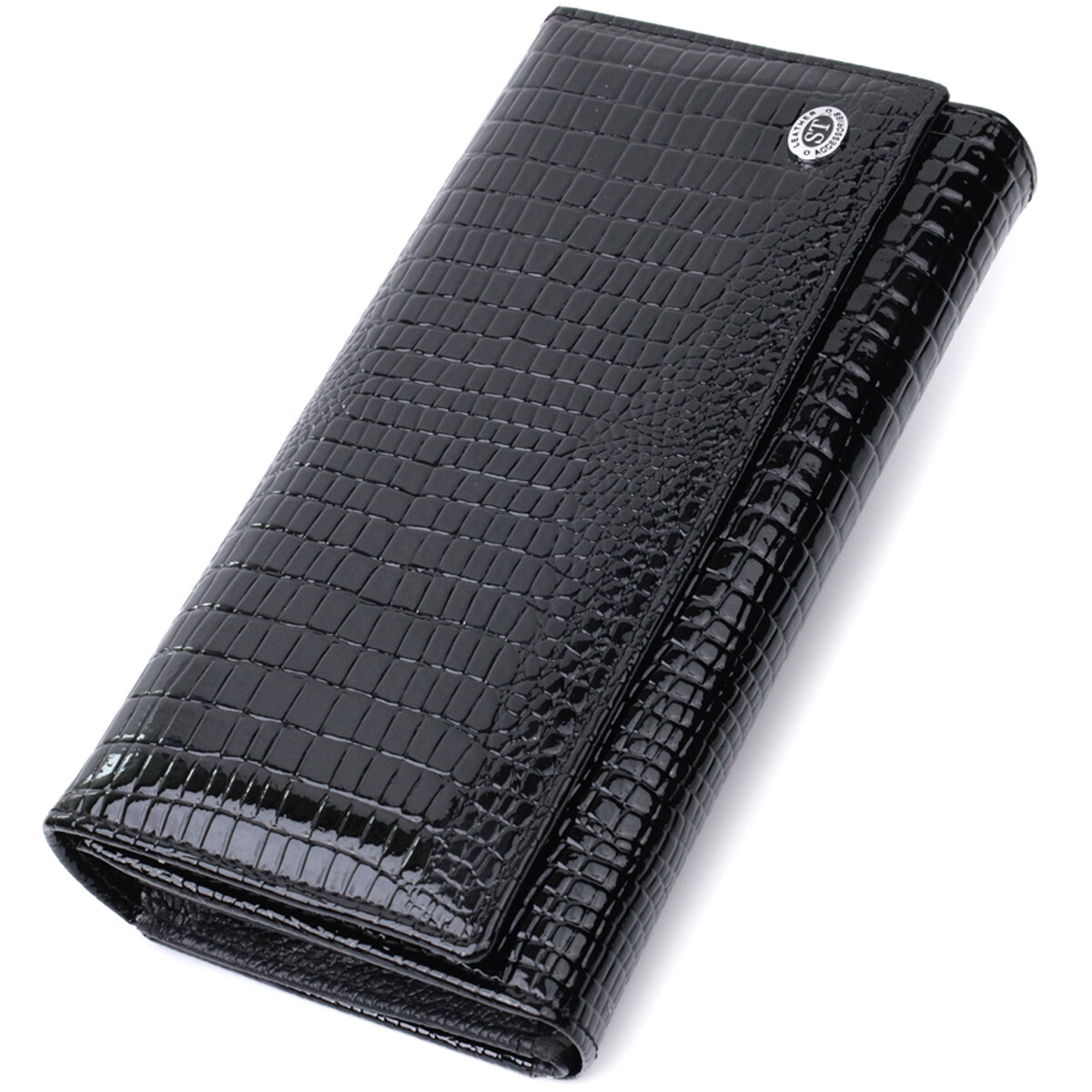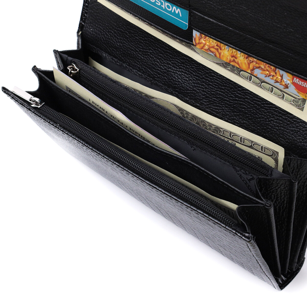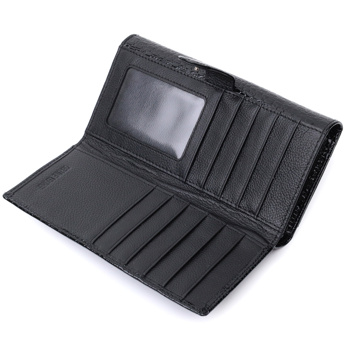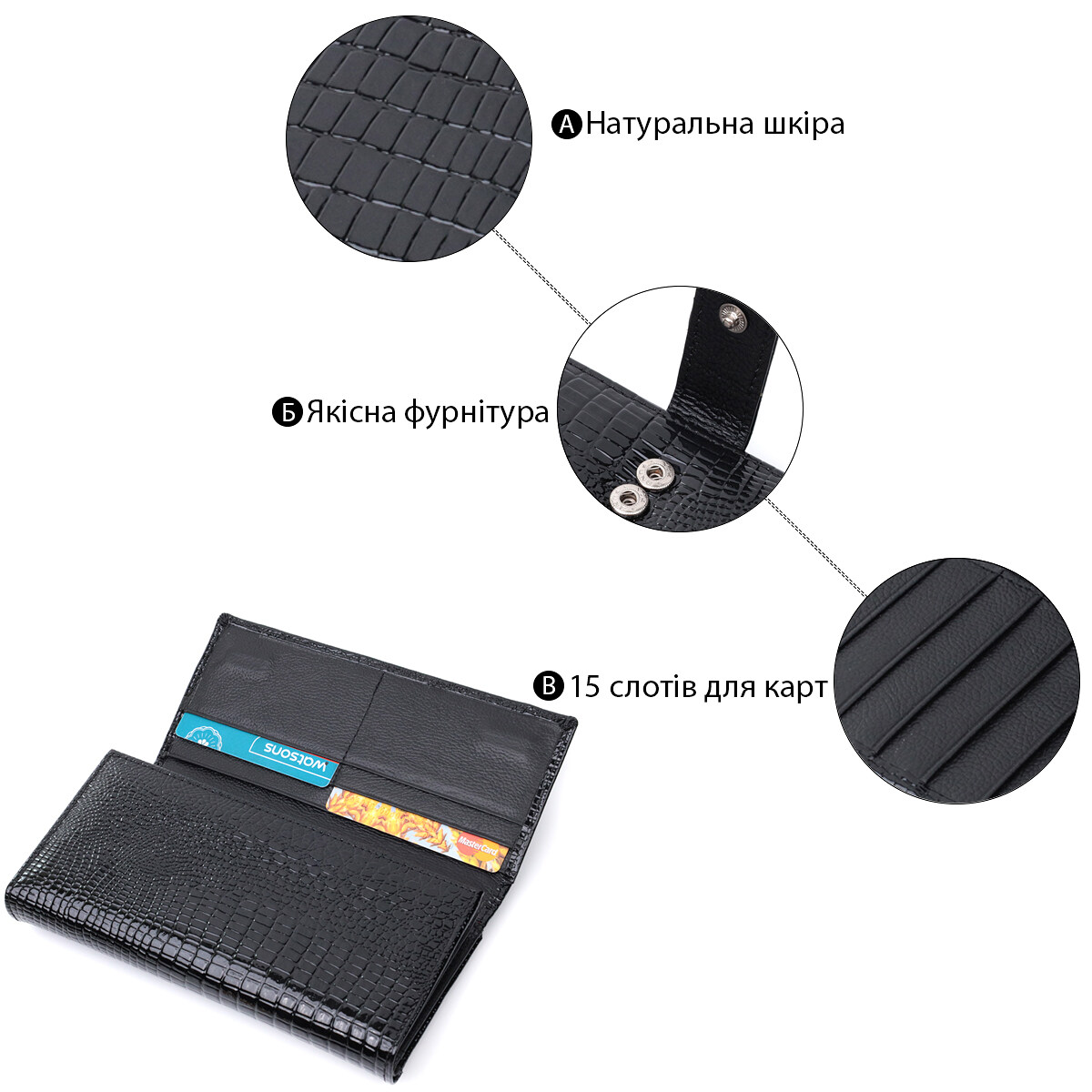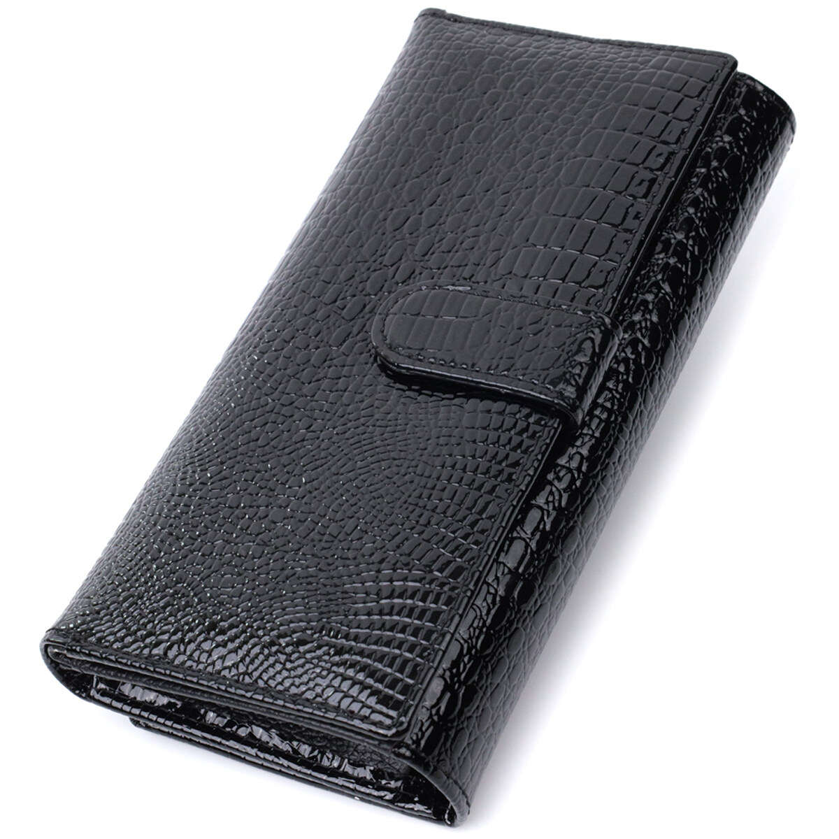 Стильний гаманець для жінок із високоякісної лакованої шкіри із тисненням під рептилію. Має все необхідне, щоб стати Вам незамінним аксесуаром у повсякденному рутинному житті. Ви легко помістите в нього паперові купюри, монети, документи. Фішкою цього гаманця є блок для карт, особливістю якого є наявність двох кнопок, що дозволяє регулювати заповнення блоку. На лицьовій стороні, у правому нижньому кутку розташований металевий логотип виробника, що є запорукою якості виробу. Запакований аксесуар у білу щільну картонну коробку з фірмовим логотипом. Якщо Ви вирішите такий аксесуар подарувати близькій людині, то Вам гарантовано будуть дуже вдячні.