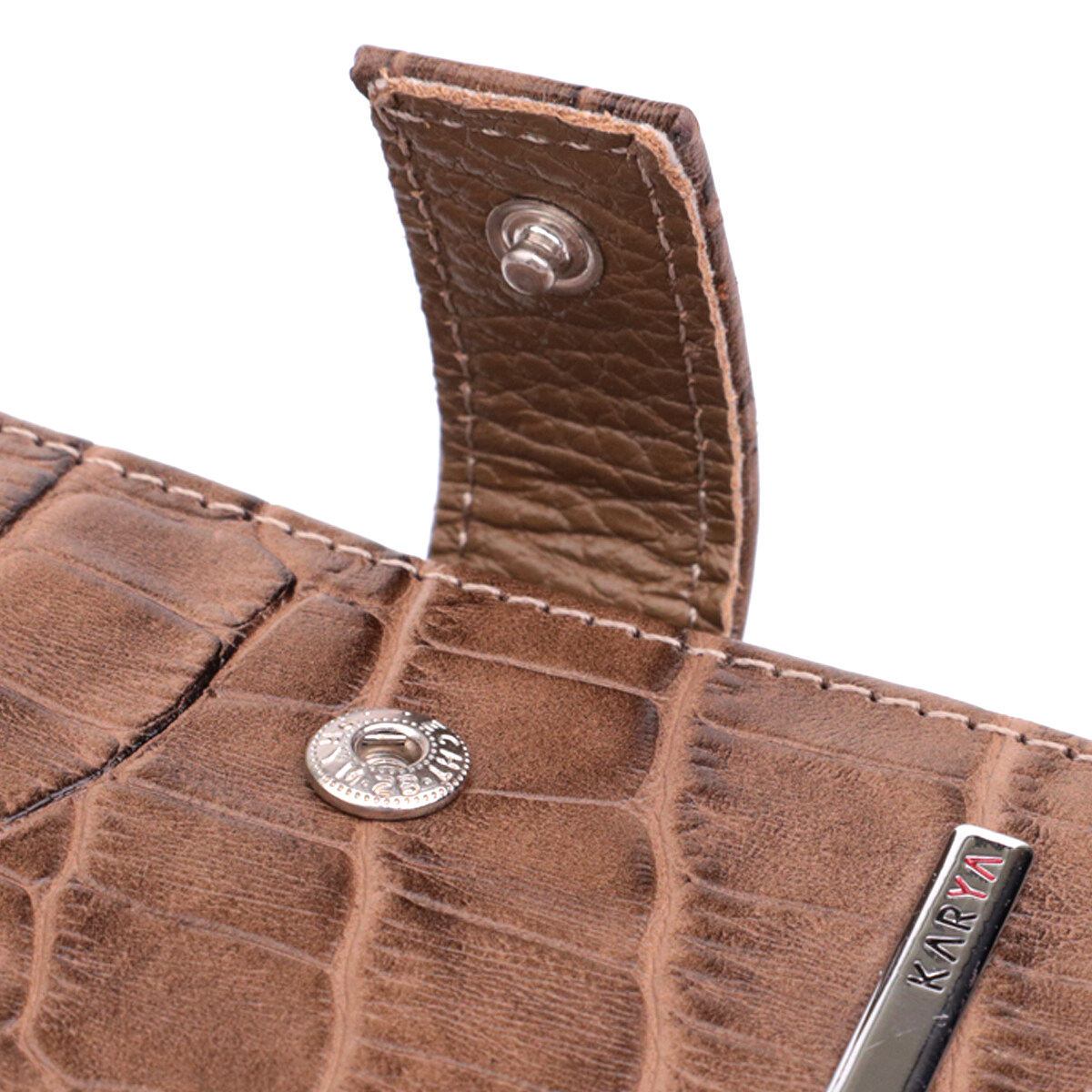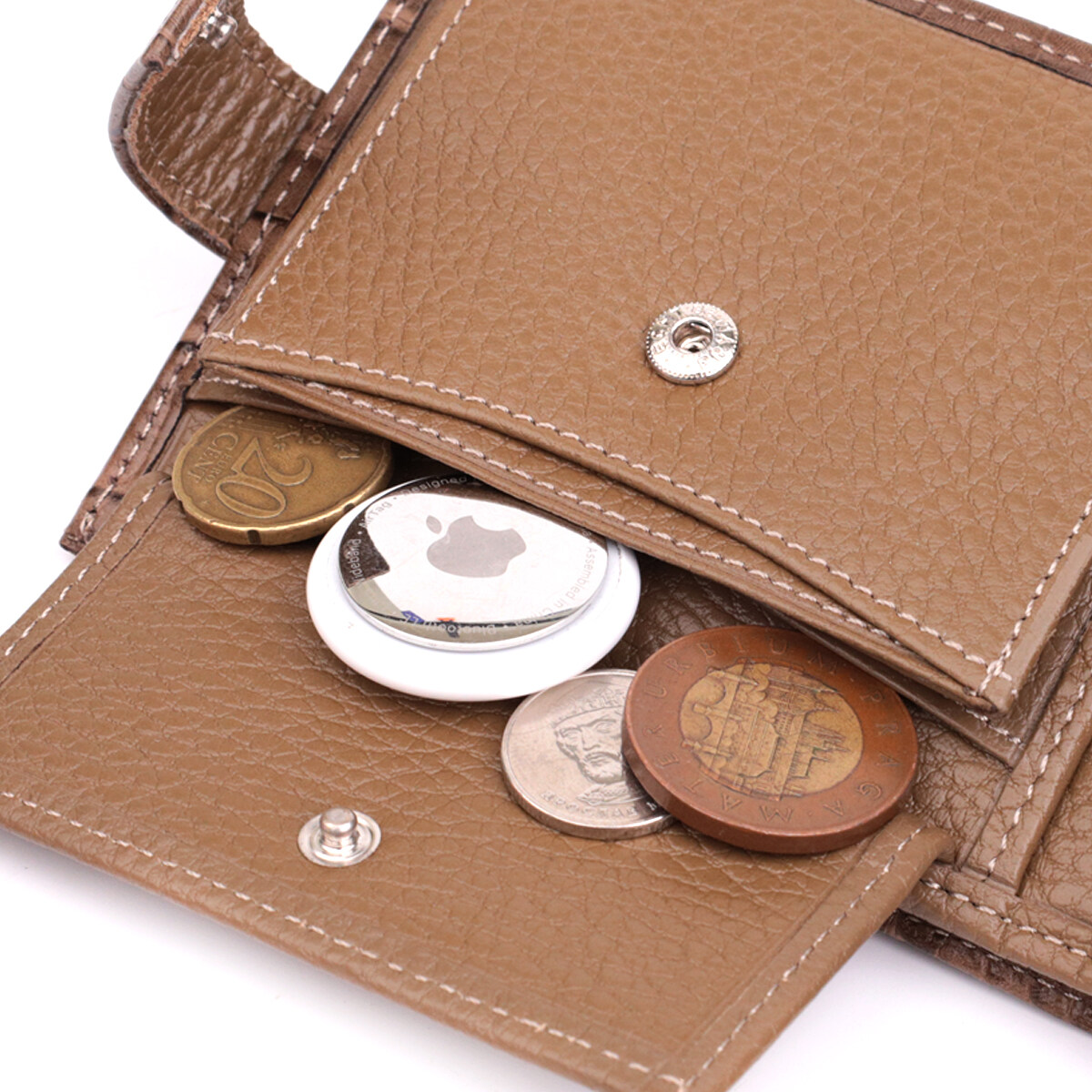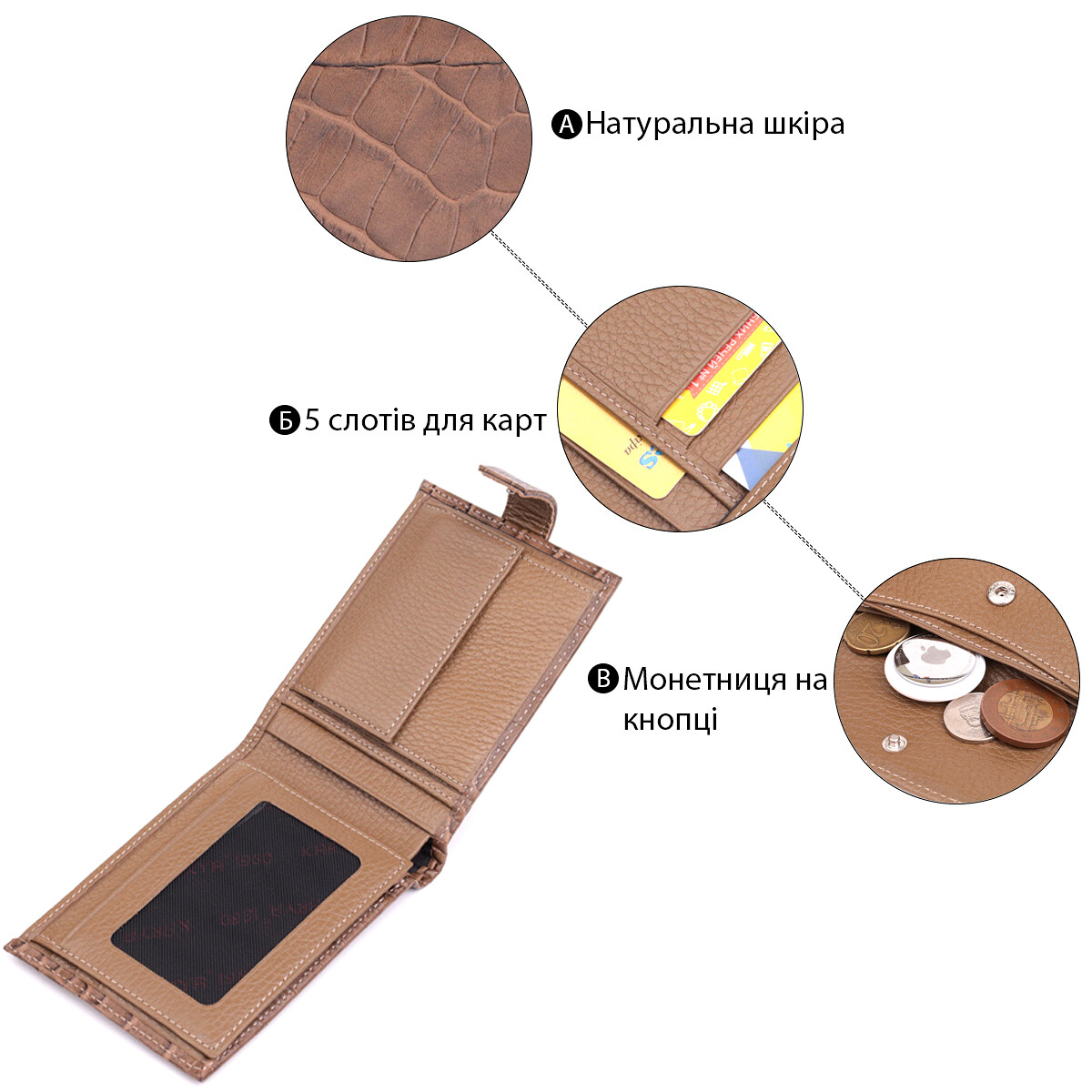 Зручний чоловічий гаманець із натуральної шкіри із тисненням під крокодила, у красивому коричневому кольорі. Виріб закривається на хлястик із кнопкою. На лицьовій стороні у вигляді декору розташований логотип виробника. Аксесуар упакований у фірмову коробочку. Вироби з натуральної шкіри завжди будуть чудовим подарунком для близької людини.