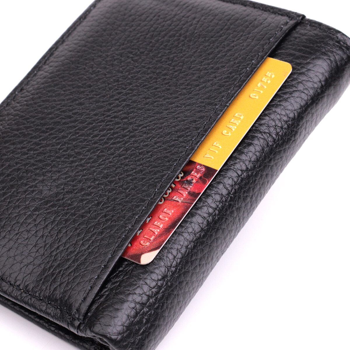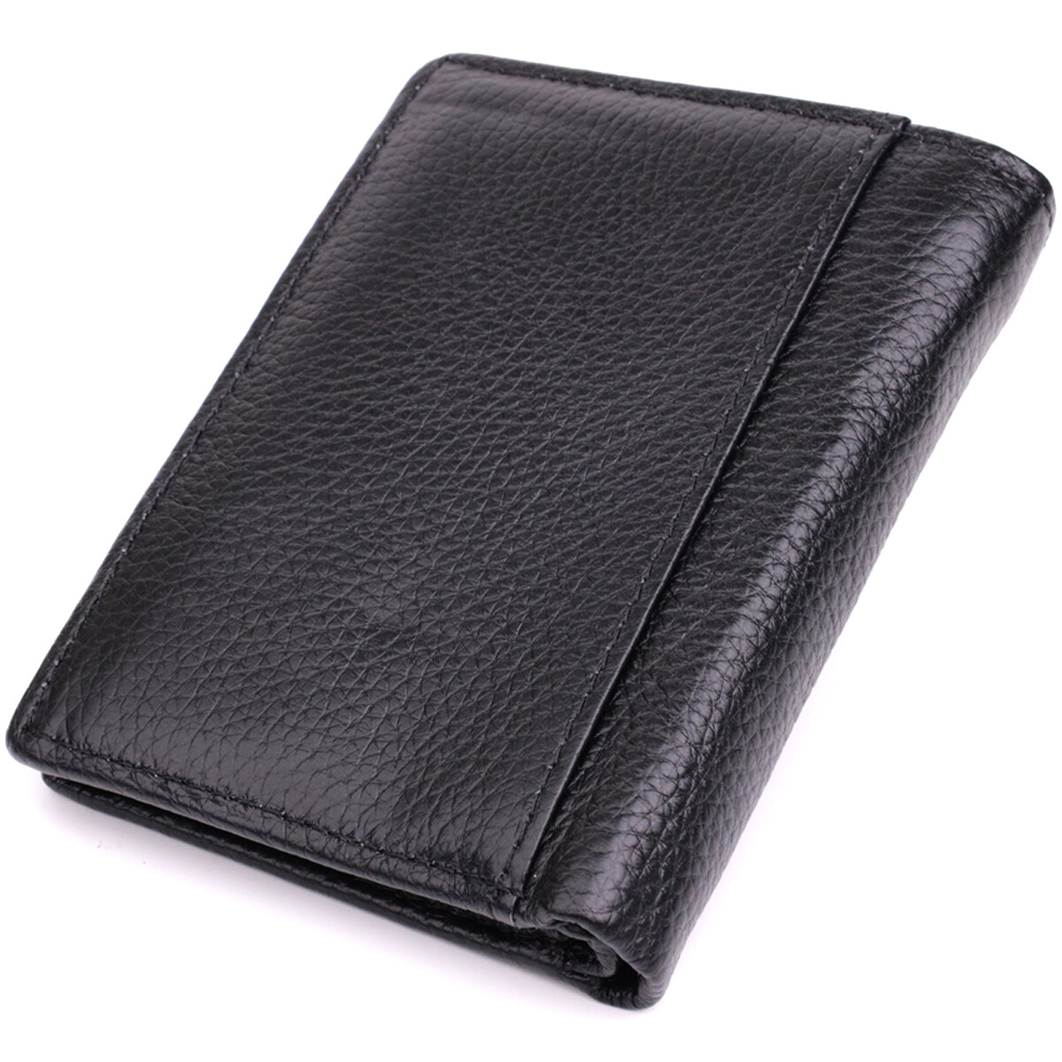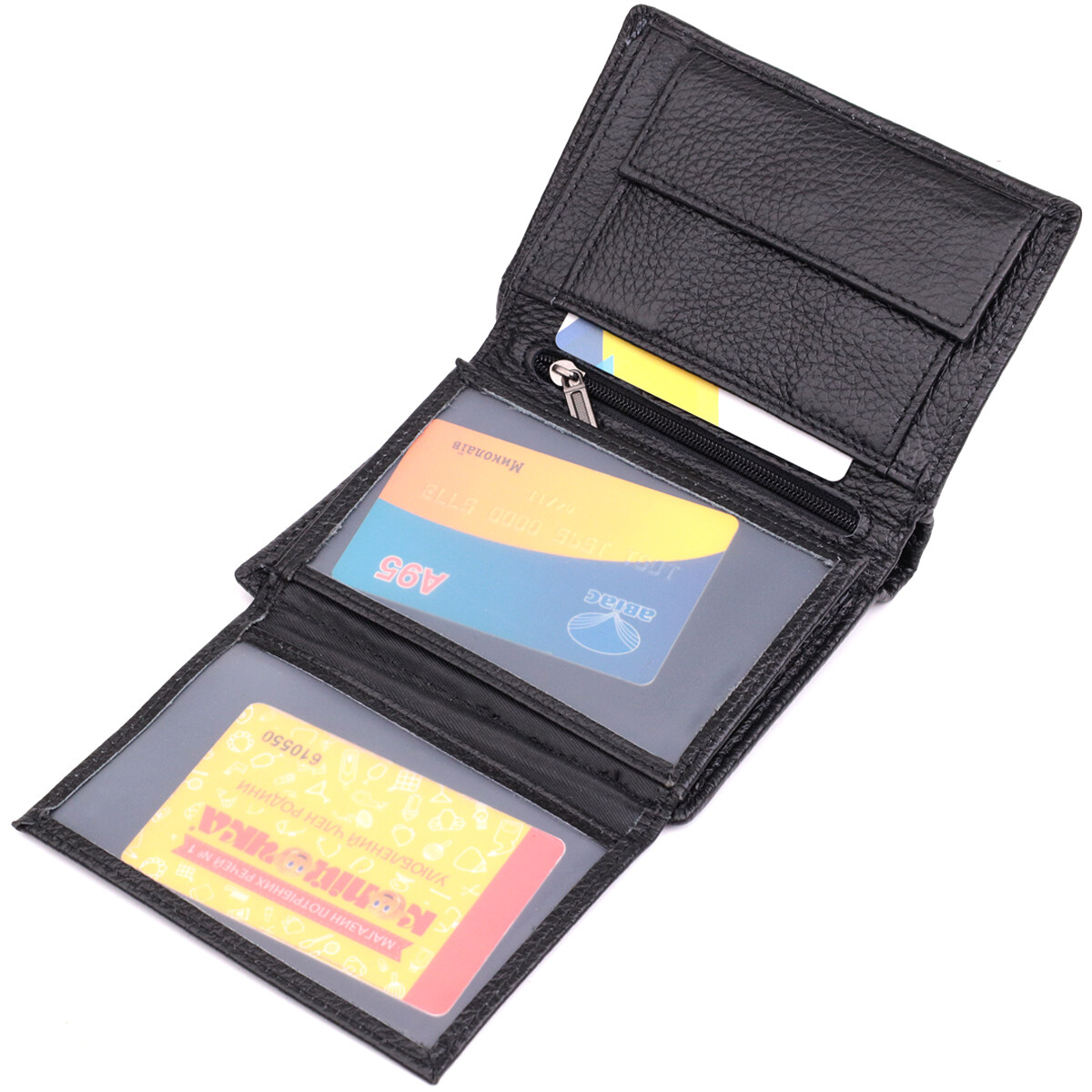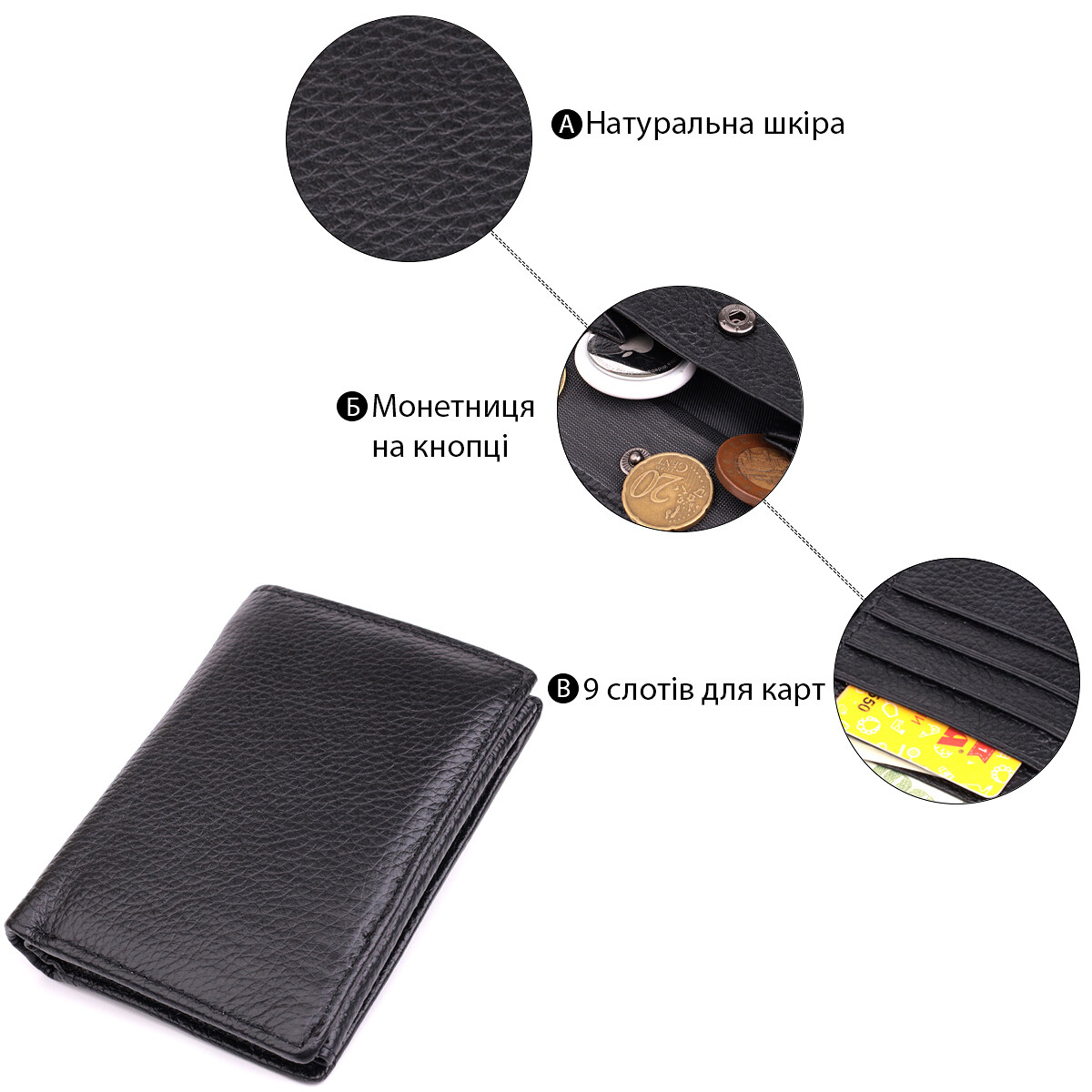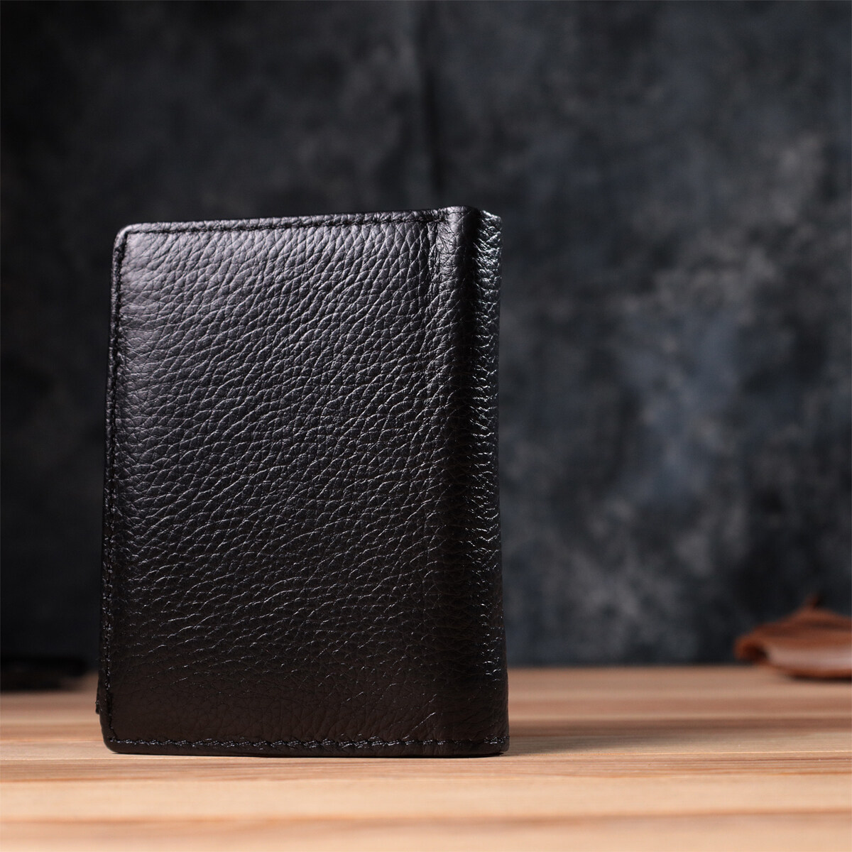 Якісне шкіряне портмоне з достатньою кількістю осередків для кредиток. У портмоне поміститься достатня кількість купюр різного номіналу, карток та дрібниць. Аксесуар виконаний у м'якій шкірі та в класичному чорному кольорі з простим та невимушеним дизайном. У комплекті йде пилозахисний чохол. Шкіряний гаманець – найкращий подарунок як для себе, так і на подарунок.