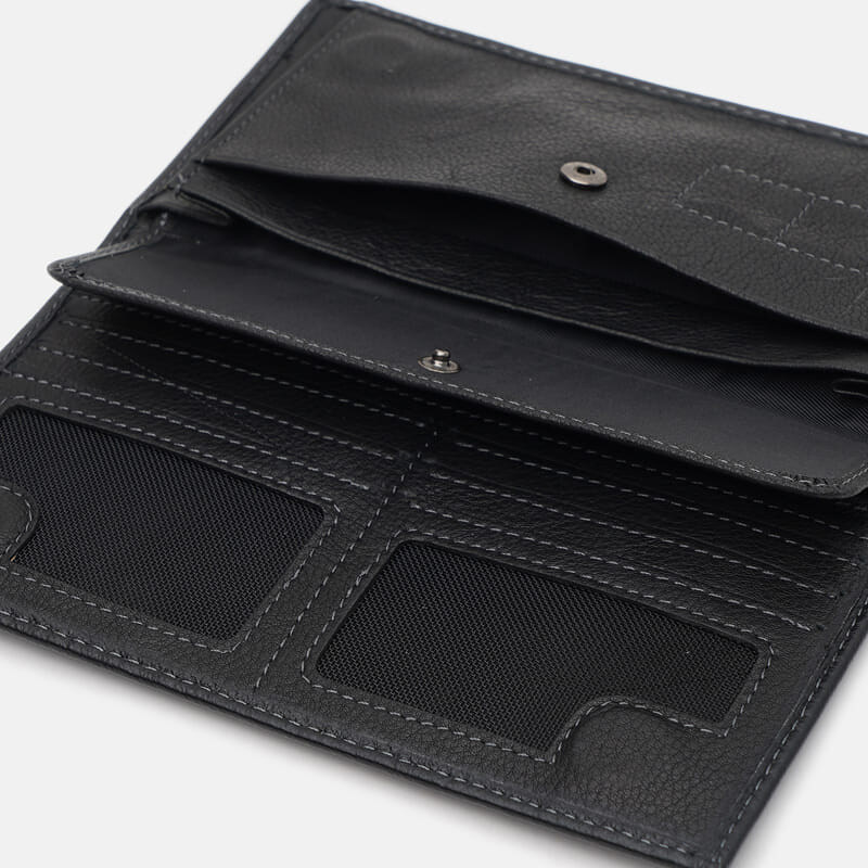 Чоловічий шкіряний гаманець виконаний із якісної натуральної шкіри. Закривається на магніти. Має 3 відділення під купюри, 1 кишеню на блискавці, 1 монетницю та 8 відділів під карти та документи. Підкладка-текстиль.