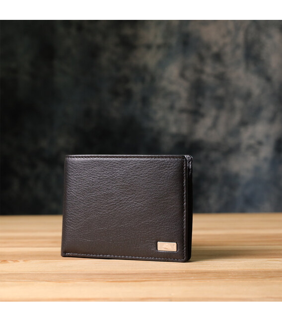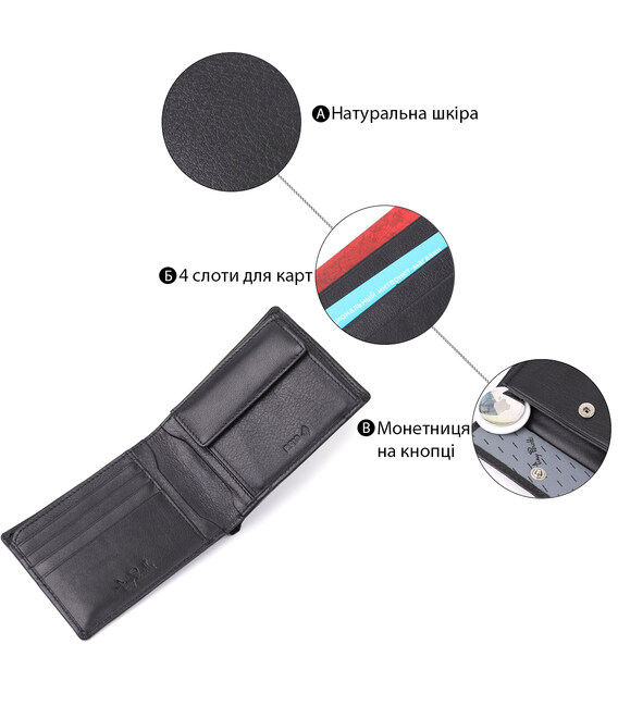 Гаманець виконаний з першокласної італійської натуральної шкіри, відрізняється м'якістю та довговічністю. Усередині передбачені чотири осередки для карток, дві прилеглі кишені, монетниця на кнопці та два відділення для купюр. На лицьовій стороні в правому нижньому кутку розташований металевий логотип бренду, що підкреслює статус і справжність виробу. Дизайн без застібки робить модель лаконічною та зручною у використанні.
