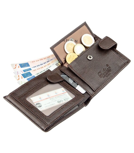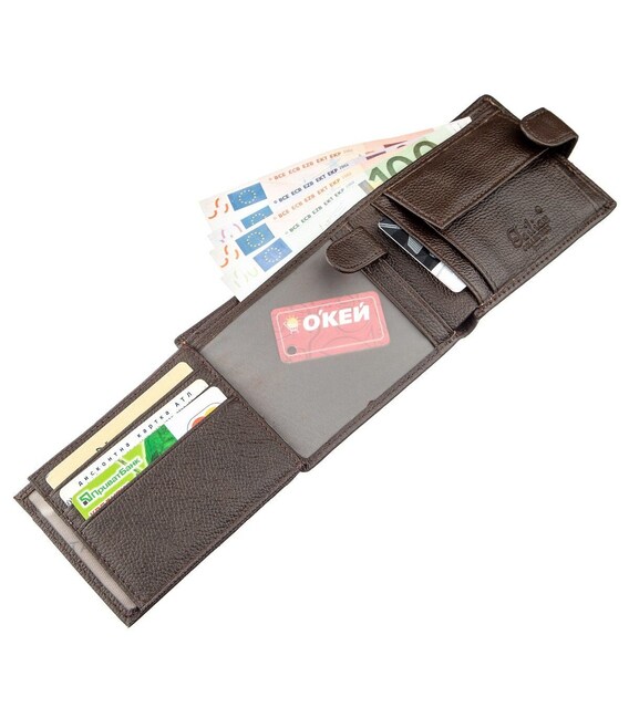 Горизонтальний, шкіряний чоловічий гаманець з натуральної шкіри. Модель гаманця з монетницею на кнопці і трьома відділеннями під прозорою плівкою. Гаманець не займає багато місця і легко поміститься в чоловічу сумку. Модель підійде для всіх типів купюр. По краях аксесуар прошитий рівним рядком. Усередині модель виконана зі шкіри в поєднанні з текстильної підкладкою коричневого кольору.