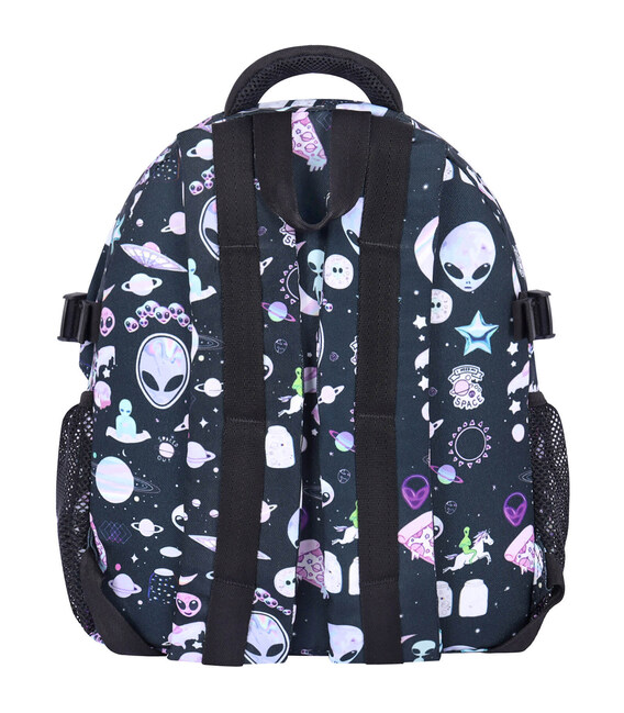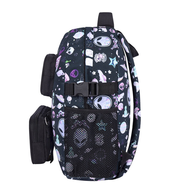 Ззовні з обох боків є відсіки для пляшки з водою чи термочашки, а спереду — кишеня для дрібниць та бананка, яка кріпиться до рюкзака за допомогою липучки.