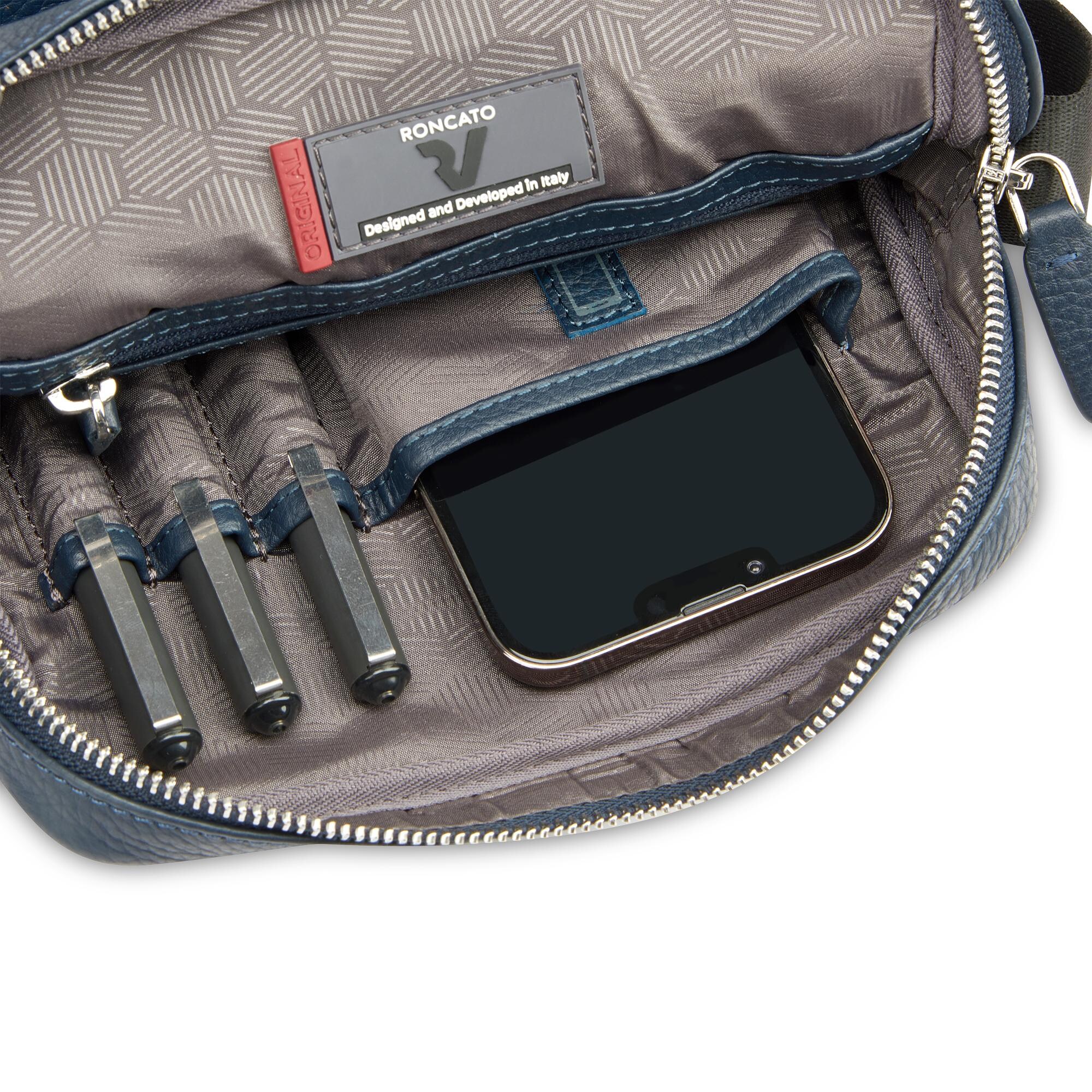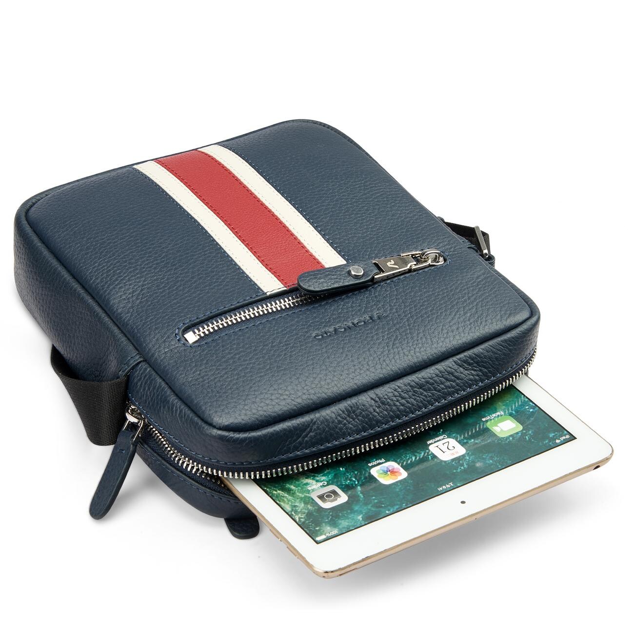 Вертикальна сумка через плече, виготовлена з натуральної шкіри. Оснащена глибоким основним відділенням з відділами для смартфона, планшета 11" та пишучих предметів. З зовнішнього боку сумки розміщена невелика кишеня для речей першої необхідності. Також, задня частина виробу оснащена додатковою кишенею на блискавці. Для зручності перенесення сумка обладнана ременем, що регулюється по довжині.