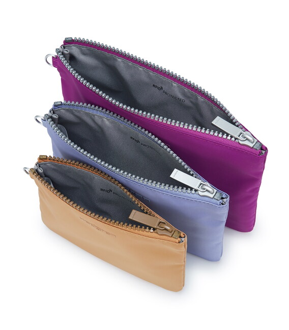 Цей набір з трьох косметичок, що ідеально підходить для зберігання ваших грошей, карток та інших дрібних предметів, стане ідеальним доповненням до будь-якої з сумок. Кожен виріб виготовлений з легкого нейлону, що забезпечує довговічність та міцність. Поверхня водовідштовхувальна і містить RFID-захист, тому ви можете зберігати свої особисті речі, не побоюючись крадіжки даних. Доступний у трьох різних кольорових комбінаціях, ви можете вибрати той, який найкраще підходить для вашої сумки, гарантуючи, що ви завжди виглядатимете стильно та організовано.