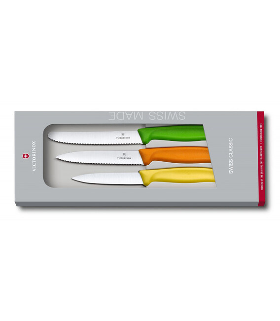 Victorinox Swiss Classic Paring Set [6.7116.31G] - набір із 3-х кухонних ножів для чищення з руків'ям жовтого, помаранчевого і салатового кольору.У наборі:1. Ніж з серейторним лезом 11 см і закругленою формою кінчика.2. Ніж з серейторним лезом 10 см; загострений кінчик.3. Ніж з гладким лезом 8 см; загострений кінчик.Призначені для чищення овочів, фруктів, а також іншої роботи, де важлива точність і мобільність кухонного ножа. Наприклад, зручно позбавити болгарський перець від насіння або нарізати часник, зелень. Неймовірно гострі і довговічні помічники на вашій кухні.Набір представлений в популярній лінійці Swiss Classic (Свісс Класік) з найбільшим вибором кольорових ручок, варіантів довжини і заточування леза. Кухонні ножі Victorinox (Вікторінокс) - висока якість виготовлення і бездоганна продуктивність. Ергономічні ручки зі стабільним хватом і професійне заводське заточування для легкої і продуктивної експлуатації.- Для чищення овочів і фруктів; дрібної роботи.- Леза зі штампованої неіржавної сталі високої якості.- Яскраві нековзкі ручки з поліпропілену.- Можна мити в посудомийній машині.- Набір постачається у подарунковій коробці.Поспішайте купити кухонні ножі Victorinox 6.7116.31G, поки вони є в наявності. Брендовий магазин chemodanoff.com.ua - 100% оригінал від Вікторінокс.