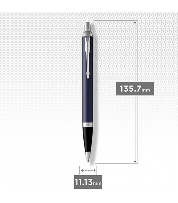 Parker IM Blue CT BP (темно-синій матовий дизайн із хромуванням) - класична кулькова модель з основного асортименту колекції IM. Характеризується динамічним конусоподібним силуетом. Зручний та статусний інструмент для письма з міцним латунним корпусом.Ручка використовує стрижень QuinkFlow для плавного потоку чорнила та рівномірно насичених ліній. Ручка пише м'яко, чорнило не розмазується. Запасу чорнила вистачає приблизно для лінії 3,5 км, тому ця ручка просто створена для вас, якщо ви часто й багато пишете.Корпус - латунь + темно-синій матовий лак.Чорна пластикова грип-секція. Сріблясте оздоблення затискача-стріли та кілець - хромування. Класичний натискний механізм з кнопкою. У ручку вставлений кульковий стрижень.Подарункова коробка Parker.Оригінальні ручки Parker у різноманітному асортименті оздоблень. На А ttribute.ua представлені всі колекції письмових інструментів Parker. Швидка доставка та вигідні ціни на справжню брендову продукцію.