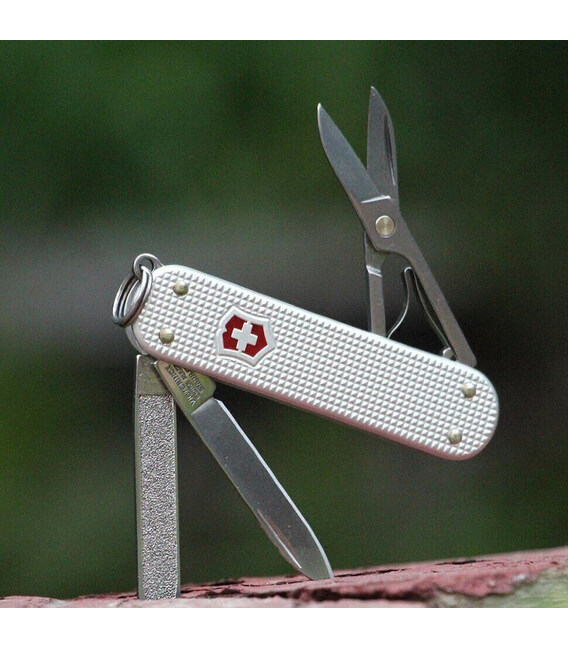 Неймовірно стильний і міцний швейцарський мультиінструмент CLASSIC ALOX зі сріблястими рифленими накладками Alox із анодованого алюмінію. Компактний кишеньковий ніж 58 мм швейцарського виробництва з 5 функціями. Оригінальна модель з логотипом компанії Victorinox (Вікторінокс). 1. маленький клинок 2. пилочка для нігтів 3. - викрутка 2,5 мм 4. ножиці 5. кільце для підвішування Компактний складаний формат, максимально зручний для щоденного використання. Ніж із лінійки Classic має довжину в складеному вигляді 58 мм. Багатофункціональний і елегантний помічник, в якому ви зустрінете всі можливості, необхідні вам на кожен день. У комплекті маленький чорний чохол зі шкірозамінника.Колекція: Alox Модель: Classic SD Номер за каталогом: 0.6221.26 Бренд: Victorinox AG, Швейцарія 5 функцій 2-рядне розташування інструментів. Маленький розмір (довжина х товщина): 58 х 6 мм. Висококласна неіржавна сталь. Срібні накладки з алюмінія. Офіціальная гарантія якості на матеріали та збірку. Зазначена модель постачається з чорним чохлом.Купити складаний ніж Victorinox (Вікторінокс) Classic ALOX 0.6221.26 на сайті chemodanoff.com.ua - 100% оригінал, сертифікований гарантійний сервіс і швидка доставка до вашого міста.