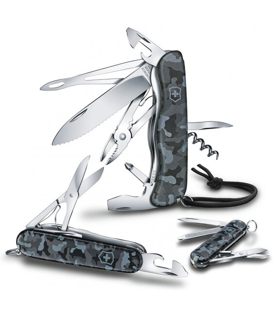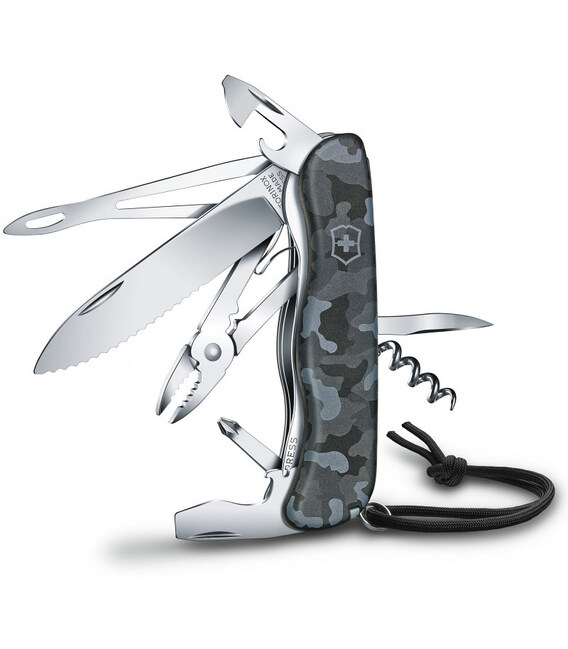Великий кишеньковий ніж SKIPPER NAVY CAMOUFLAGE з фіксатором леза Liner Lock / 111мм / 18 функцій / синьо-сірий камуфляж / Серейторний клинок / штопор / плоскогубці / викрутки Victorinox 0.8593.W942 Швейцарія