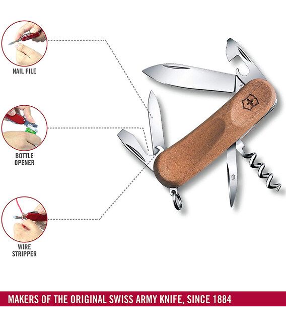 Victorinox EVOLUTION WOOD 10 - швейцарський кишеньковий ніж 85 мм (середній розмір) з 11 функціями та елегантними дерев'яними накладками. Продуктивна модель в досить компактному дизайні.Колекція: Evolution Номер моделі 2.3801.63 Коричневі накладки з натурального дерева Інструменти і внутрішня частина конструкції з високоякісної неіржавної сталі Довжина руків'я - 85 мм 11 функцій Постачається у подарунковій коробочці з оригінальним сертифікатом-вкладишем. Бренд: Victorinox (Вікторінокс) Країна виробництва: Швейцарія Висока якість матеріалів і збірки робить кишеньковий ніж Вікторінокс довговічним, точним і неймовірно продуктивним. Різальні крайки довго залишаються максимально гострими. Фірмова неіржавна сталь відрізняється високими показниками стійкості до корозії і деформації.1. великий клинок 2. відкривачка 3. - викрутка плоска 6 мм 4. - пристосування для зняття ізоляції з дроту 5. консервний ніж 6. - викрутка плоска 3 мм 7. пилочка для нігтів 8. - очищувач для нігтів 9. штопор 10. шило/дирокол 11. кільце для кріплення На ніж Victorinox Evolution 2.3801.63, як і на будь-який складаний ніж Вікторінокс, поширюється довічна гарантія на якість матеріалів і заводське виробництво. Швидка доставка - 100% Оригінальні ножі Victorinox в інтернет-магазині chemodanoff.com.ua - широка географія доставки по всій Україні.