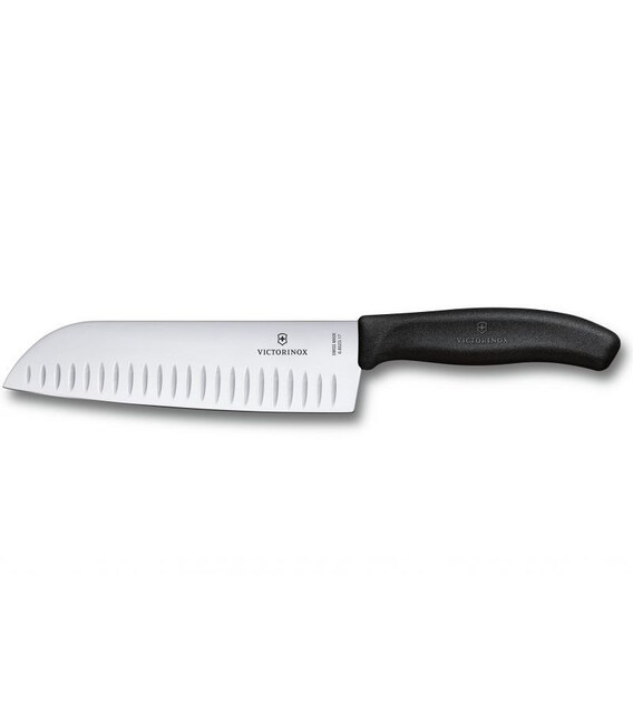 Victorinox SWISS CLASSIC Santoku [6.8523.17B] - популярний кухонний ніж-сантоку з рифленим лезом.Довжина леза 17 см - гладка заточка. Дизайн з чорною ручкою.Ніж-сантоку, або японський клинок, чудово підходить для щоденної роботи на кухні і в умілих руках стає справжнім універсалом. Прекрасно впорається з більшістю кулінарних процесів від стандартного нарізання до шинкування. Завдяки рифленій бічній поверхні мінімізує прилипання їжі до ножа.Swiss Classic (Свісс Класік) - це популярна серія кухонного інвентарю з найбільшим вибором кольорових ручок, варіантів довжини і заточування леза. Кухонні ножі Victorinox (Вікторінокс) - висока якість виготовлення і бездоганна продуктивність. Ергономічна ручка зі стабільним хватом і професійне заводське заточування для легкої і продуктивної експлуатації. Лезо чудово ріже і довго зберігає гостроту.- Лезо 17 см.- Різальна крайка: гладка (Plain).- Рифлене лезо із неіржавної сталі високої якості.- Нековзка ручка з термоеластопласту (ТПЕ).- Дозволено мити в посудомийній машині.- Упаковка - кольоровий блістер.Висококласна неіржавна сталь - це фірмова особливість швейцарської ножової компанії Victorinox, яка з 1884 року славиться виробництвом легендарних складаних армійських ножів SAK. Поспішайте купити кухонний ніж Victorinox 6.8523.17B в інтернет-магазині брендових товарів А ttribute.ua - 100% оригінал від Вікторінокс (Швейцарія).