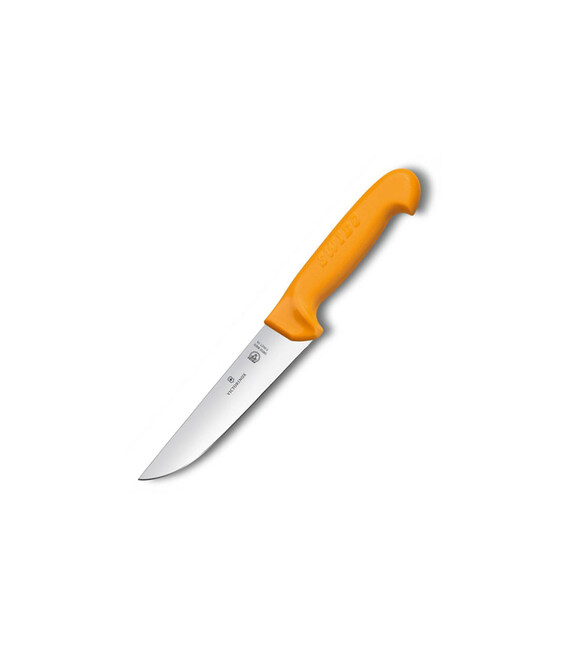 SWIBO Slaughter & Butcher [5.8421.14] - забійний ніж з широким лезом завдовжки 14 см. Швейцарський кухонний інвентар з професійної лінійки від Victorinox, яка спеціалізується на ножах для м'ясників. Чудово підійде для досвідчених м'ясників, працівників м'ясопереробних цехів, боєнь, м'ясних відділів в супермаркетах.Моделі з колекції Swibo (Свібо) легко упізнати за ергономічним руків'ям з виступом на лезо для безпечного упору рукою. Насичено-жовтий колір руків'я з назвою серії. Вони виготовлені зі стійкого до швидкого зношування полімерного матеріалу - поліамід.Точний і неймовірно гострий ніж для швидкої і якісної роботи. Мінімум зусиль - максимум результату.Кухонні ножі Victorinox (Вікторінокс) - висока якість виготовлення і бездоганна продуктивність. Ергономічна ручка зі стабільним хватом і професійне заводське заточування для легкої і продуктивної експлуатації. Лезо чудово ріже і довго зберігає гостроту.- Для забою і розбирання туш.- Лезо 14 см.- Різальна крайка: гладка (Plain).- Лезо із неіржавної сталі високої якості.- Нековзка і термостійка ручка з поліаміду (PA).- Можна мити в посудомийній машині і стерилізувати.Висококласна неіржавна сталь - це фірмовий почерк швейцарської ножової компанії Victorinox, яка прославилася виробництвом легендарних складаних армійських ножів SAK. Поспішайте купити кухонний ніж Victorinox 5.8421.14 - тільки оригінальні ножі Вікторінокс (Швейцарія) на А ttribute.ua.