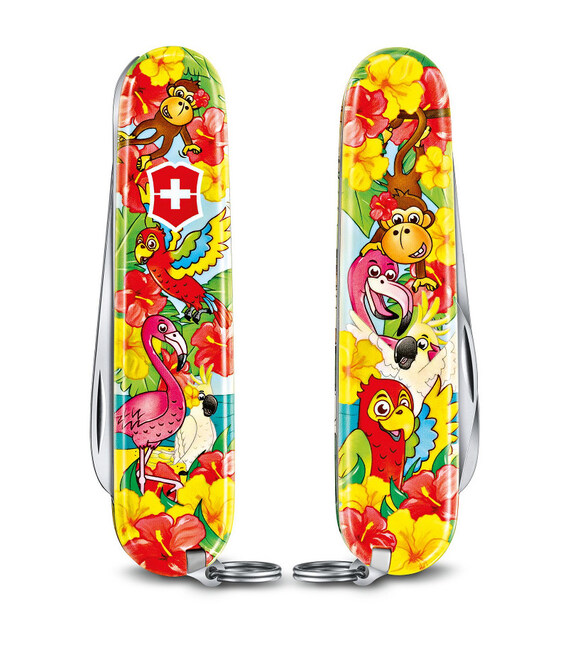 Дитячий кишеньковий ніж Animal Edition з розмальовкою MY FIRST Children Set Parrot 84мм / 2 шари / 9 функцій / кольорові накладки з папугою / пилка + шнурок на шию + книжка-розмальовка Victorinox 0.2373.E3 Швейцарія